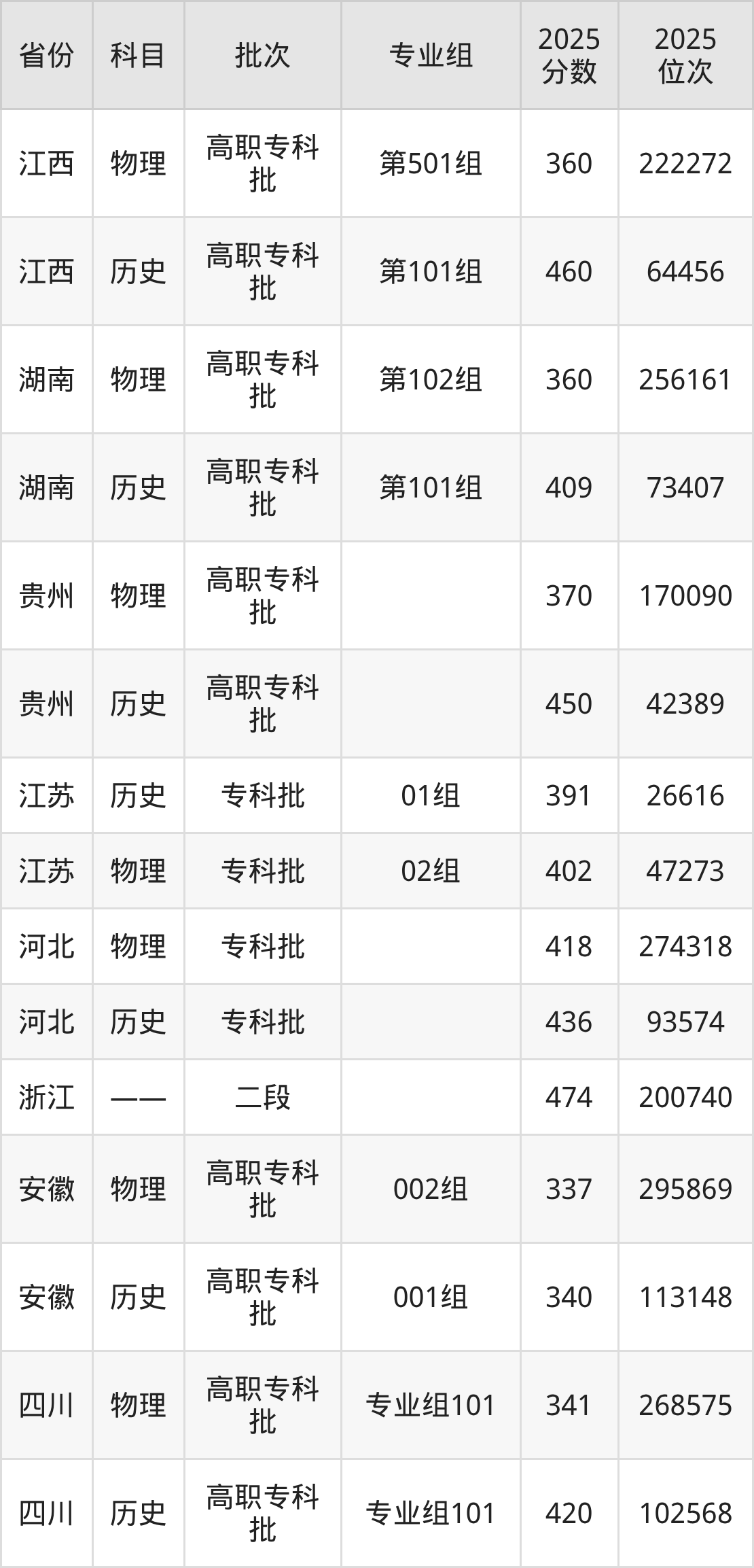 普通类专科物理类最低360分,专科历史类最低409分