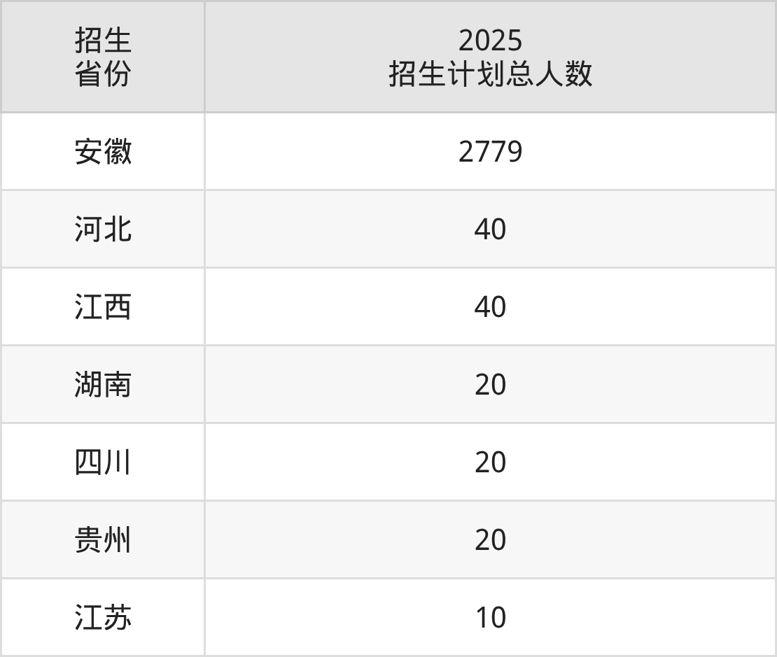 2025年安徽卫生健康职业学院面向全国7个省市开展专科招生;招生专业共24个,招生人数共2929人。2025年在安徽省招生计划总人数是2779人,其中,安徽卫生健康职业学院在安徽省招生人数最多的是护理。安徽卫生健康职业学院在各省具体招生人数情况如下表。