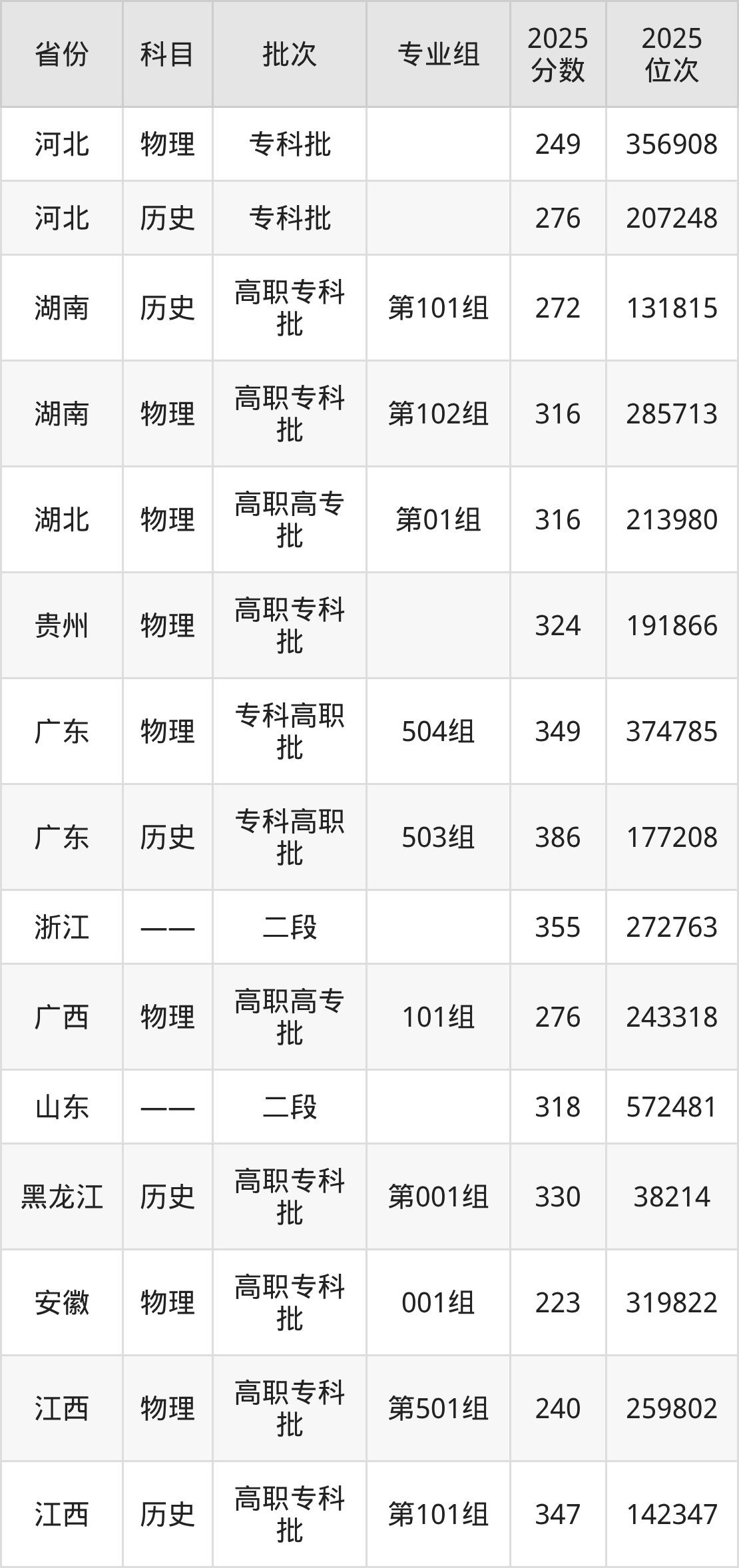 2025年在专科物理类进行招生,各专业组分数线详情如下: