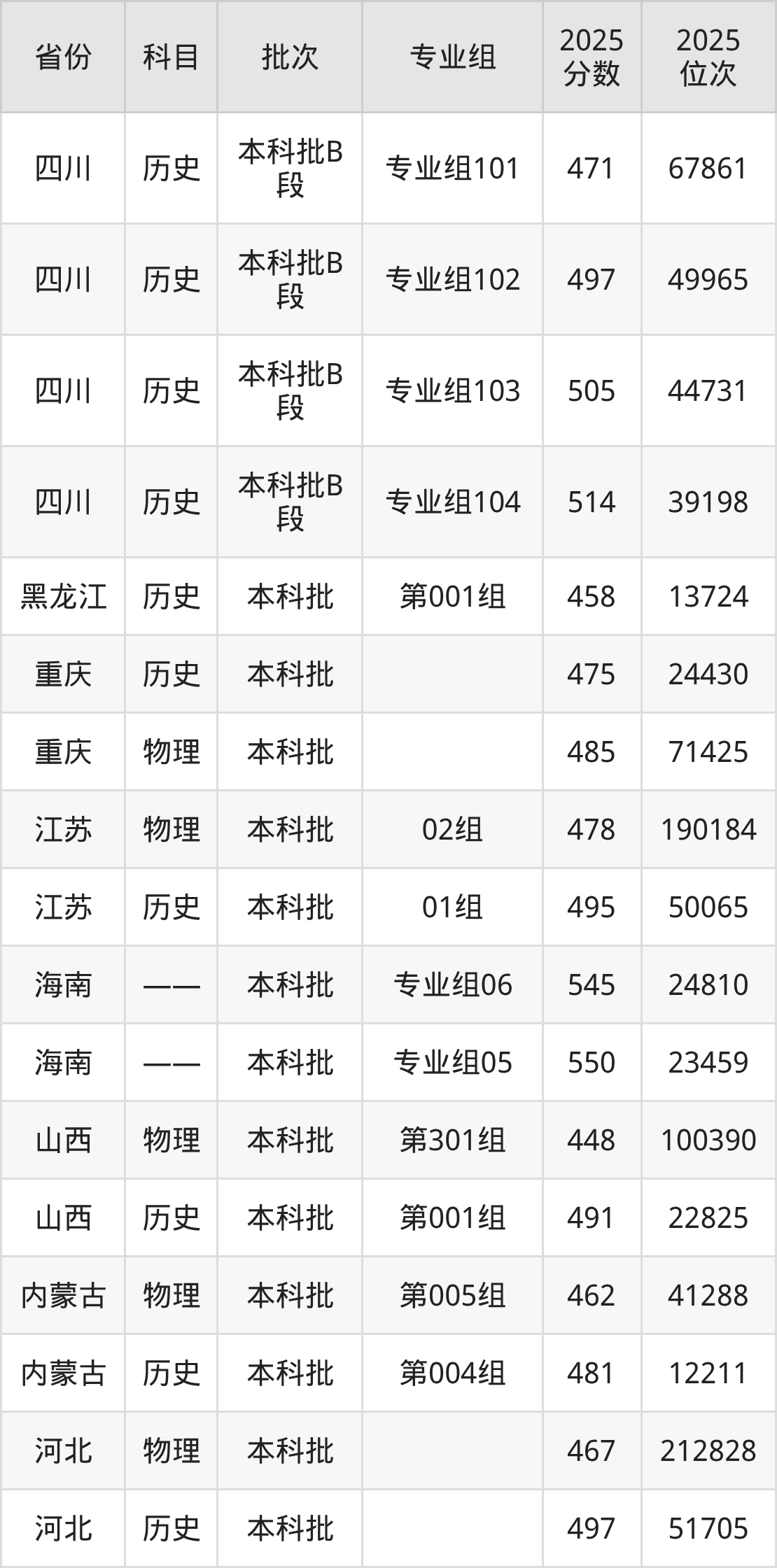 成都文理学院专业组103:2025年投档录取最低分为505分,录取最低位次为44731名。
