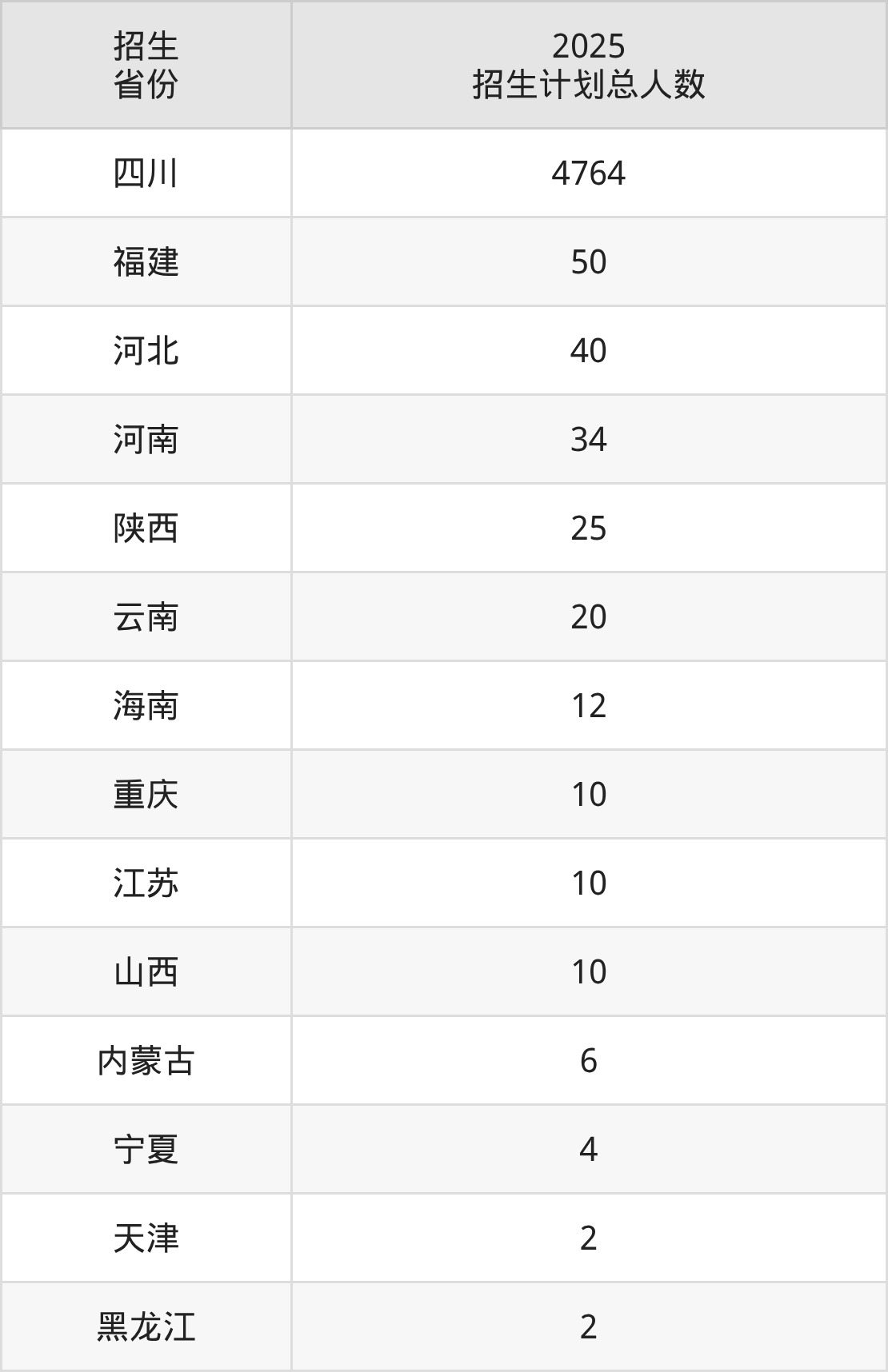 2025年成都文理学院面向全国14个省市开展本科招生;招生专业共30个,招生人数共4989人。2025年在四川省招生计划总人数是4764人,其中,成都文理学院在四川省招生人数最多的是汉语言文学。成都文理学院在各省具体招生人数情况如下表。