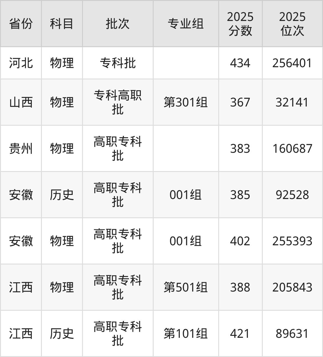 2025年在专科物理类进行招生,各专业组分数线详情如下: