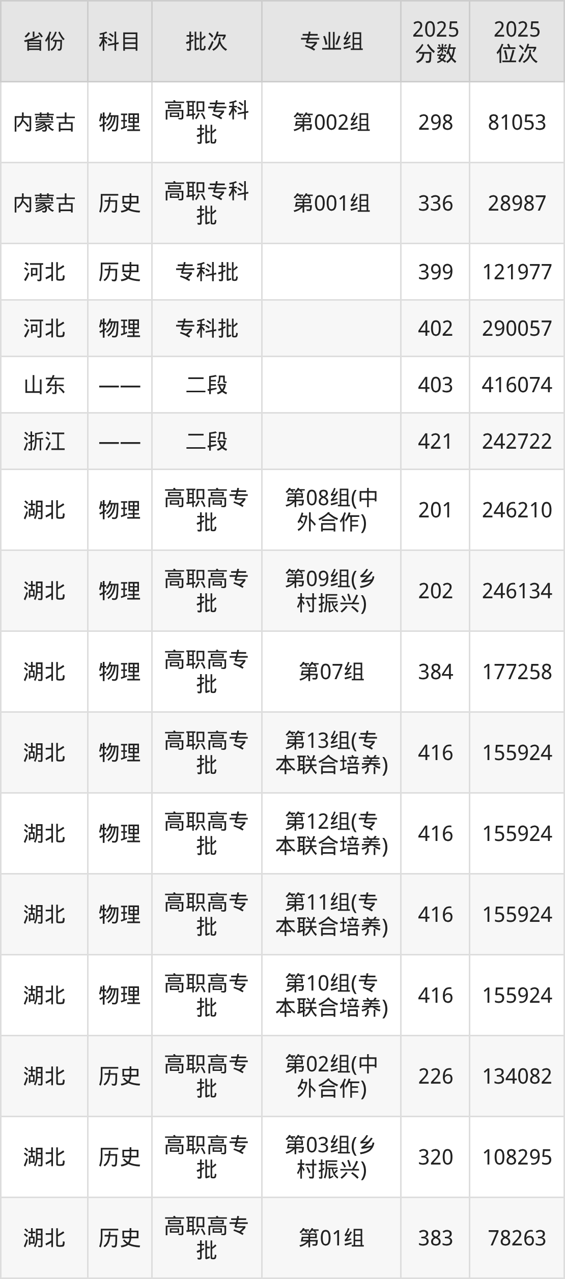 湖北城市建设职业技术学院第002组:2025年投档录取最低分为298分,录取最低位次为81053名。