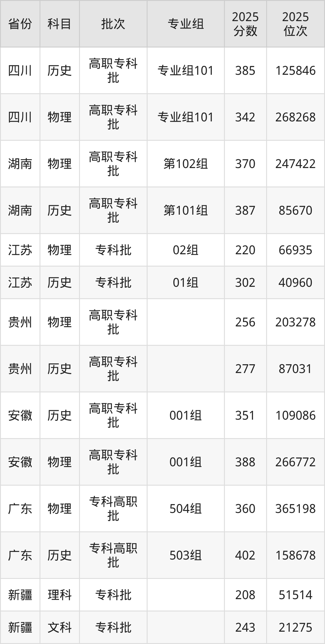 普通类专科物理类最低298分,专科历史类最低336分