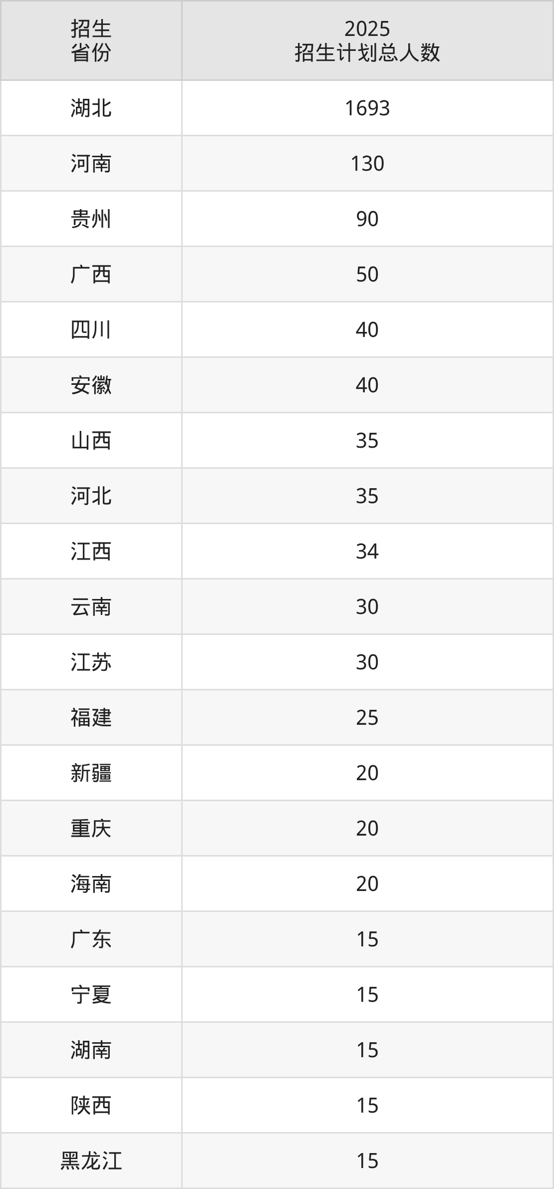 2025年湖北城市建设职业技术学院面向全国24个省市开展专科招生;招生专业共33个,招生人数共2417人。2025年在湖北省招生计划总人数是1693人,其中,湖北城市建设职业技术学院在湖北省招生人数最多的是建筑工程技术。湖北城市建设职业技术学院在各省具体招生人数情况如下表。