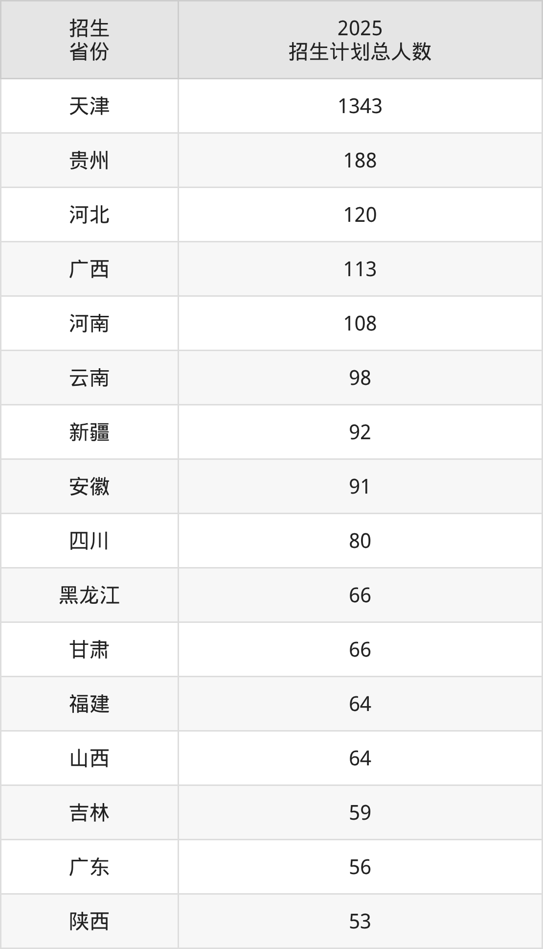 2025年天津财经大学面向全国28个省市开展本科招生;招生专业共34个,招生人数共3128人。2025年在天津市招生计划总人数是1343人,其中,天津财经大学在天津市招生人数最多的是金融学。天津财经大学在各省具体招生人数情况如下表。