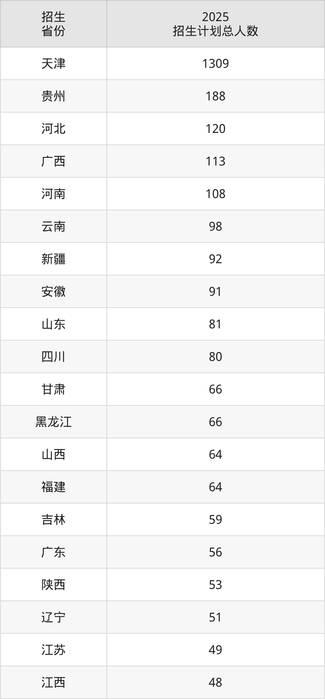 2025年天津财经大学面向全国29个省市开展本科招生;招生专业共34个,招生人数共3175人。2025年在天津市招生计划总人数是1309人,其中,天津财经大学在天津市招生人数最多的是金融学。天津财经大学在各省具体招生人数情况如下表。