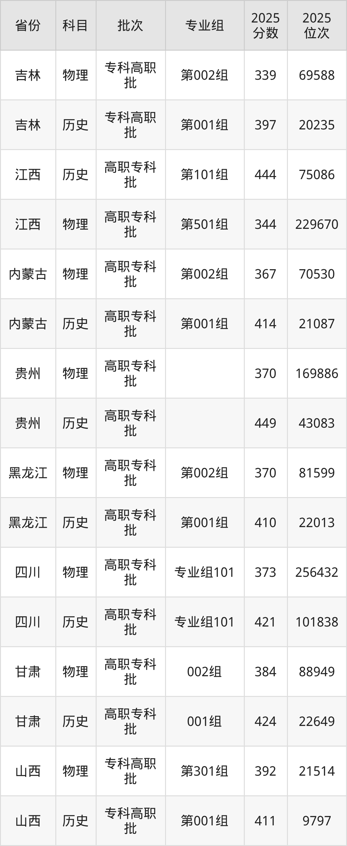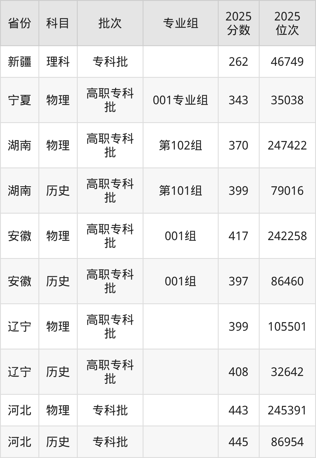 2025年在专科理科进行招生,各专业组分数线详情如下: