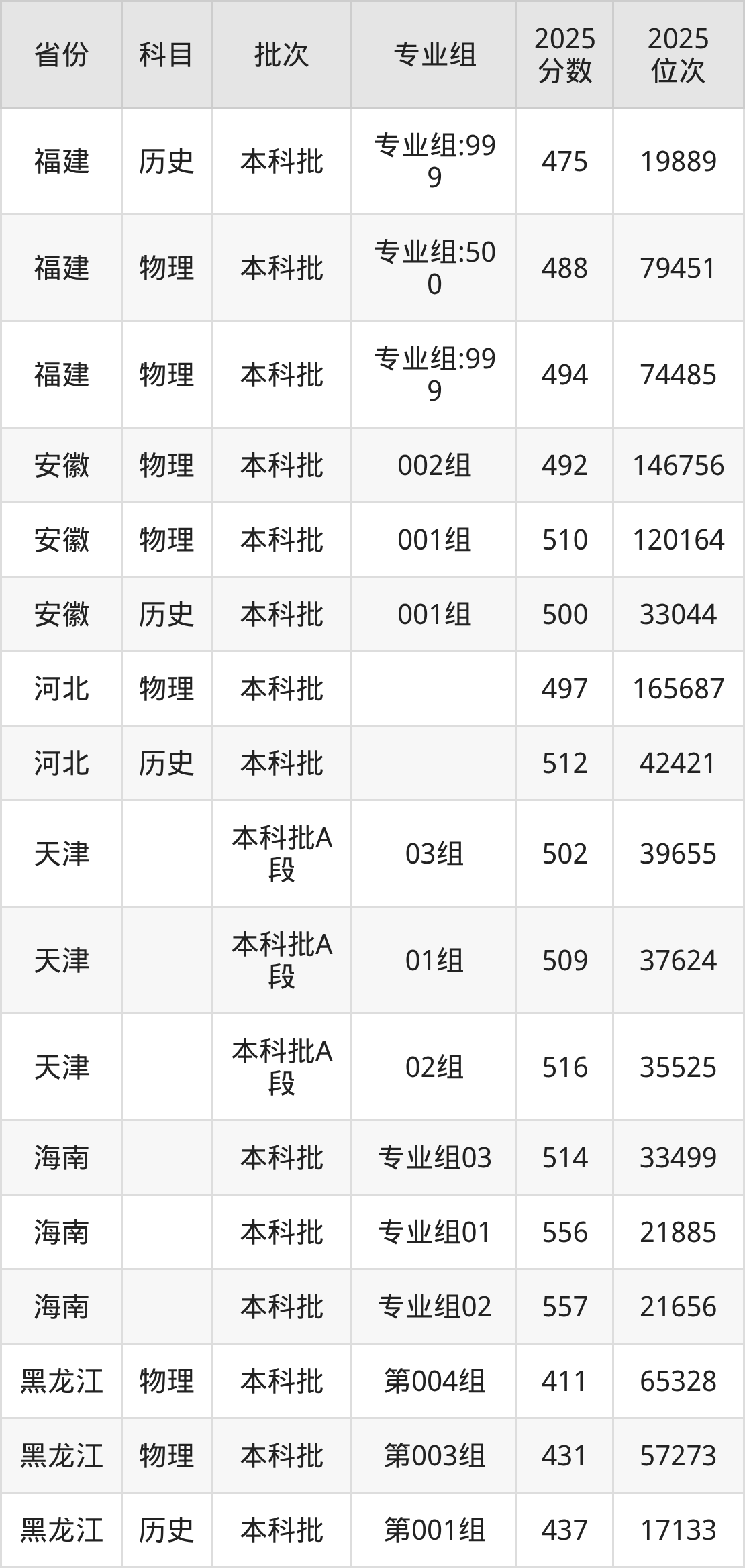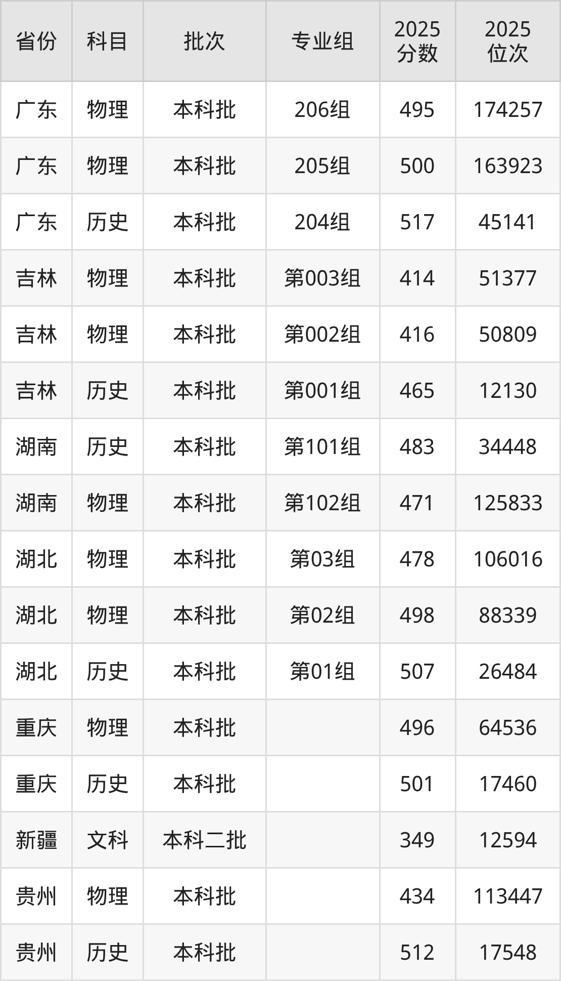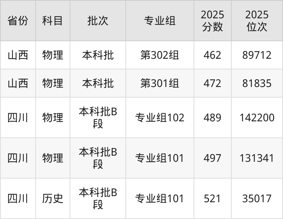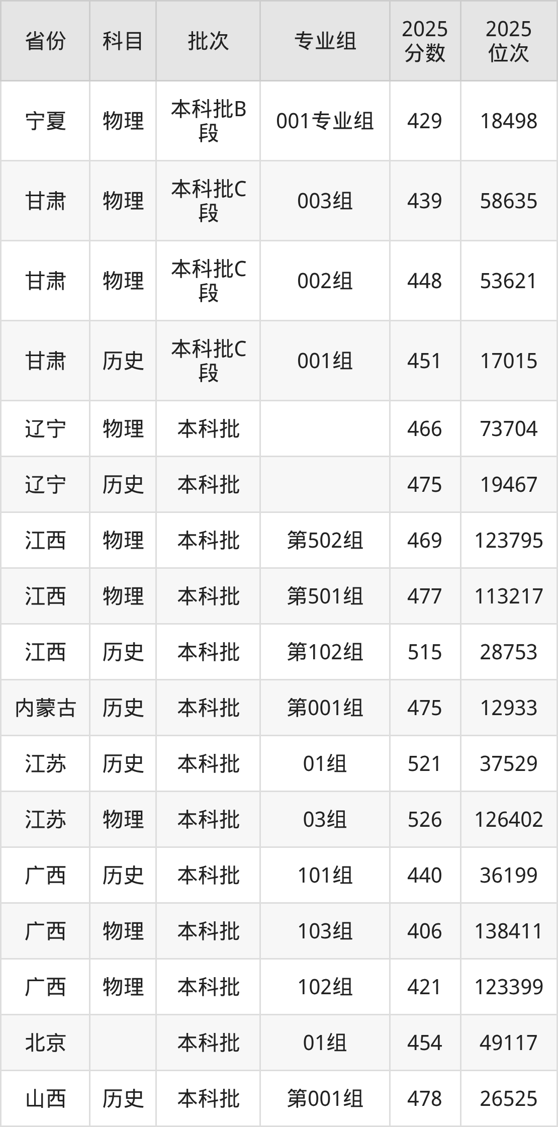 2025年在本科物理类进行招生,各专业组分数线详情如下:
