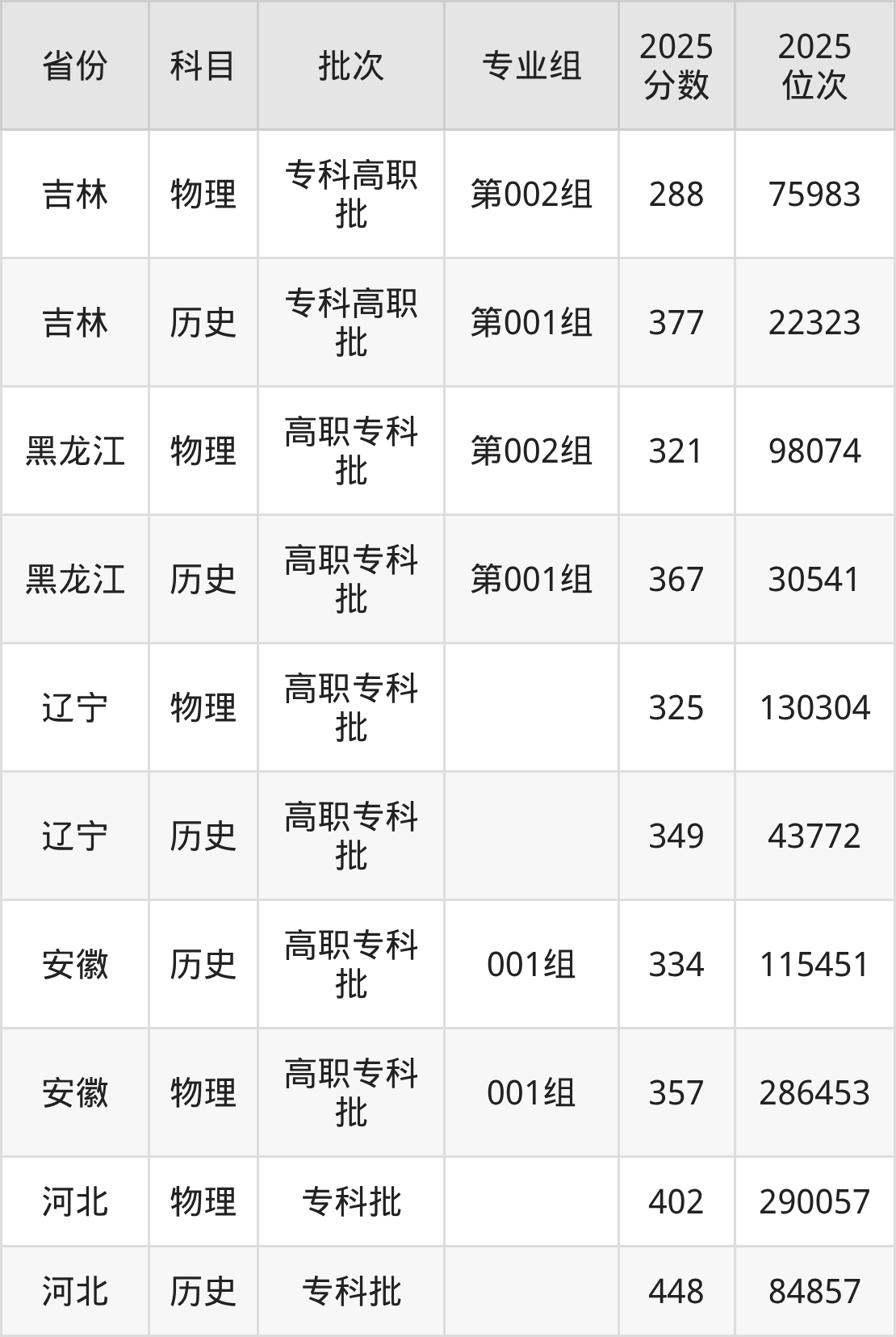 2025年鞍山职业技术学院全国录取分数线是288分到488分,录取最低在吉林物理类(第002组)、录取最高在河北物理类。各省各专业组最低分具有差异,详情如下: