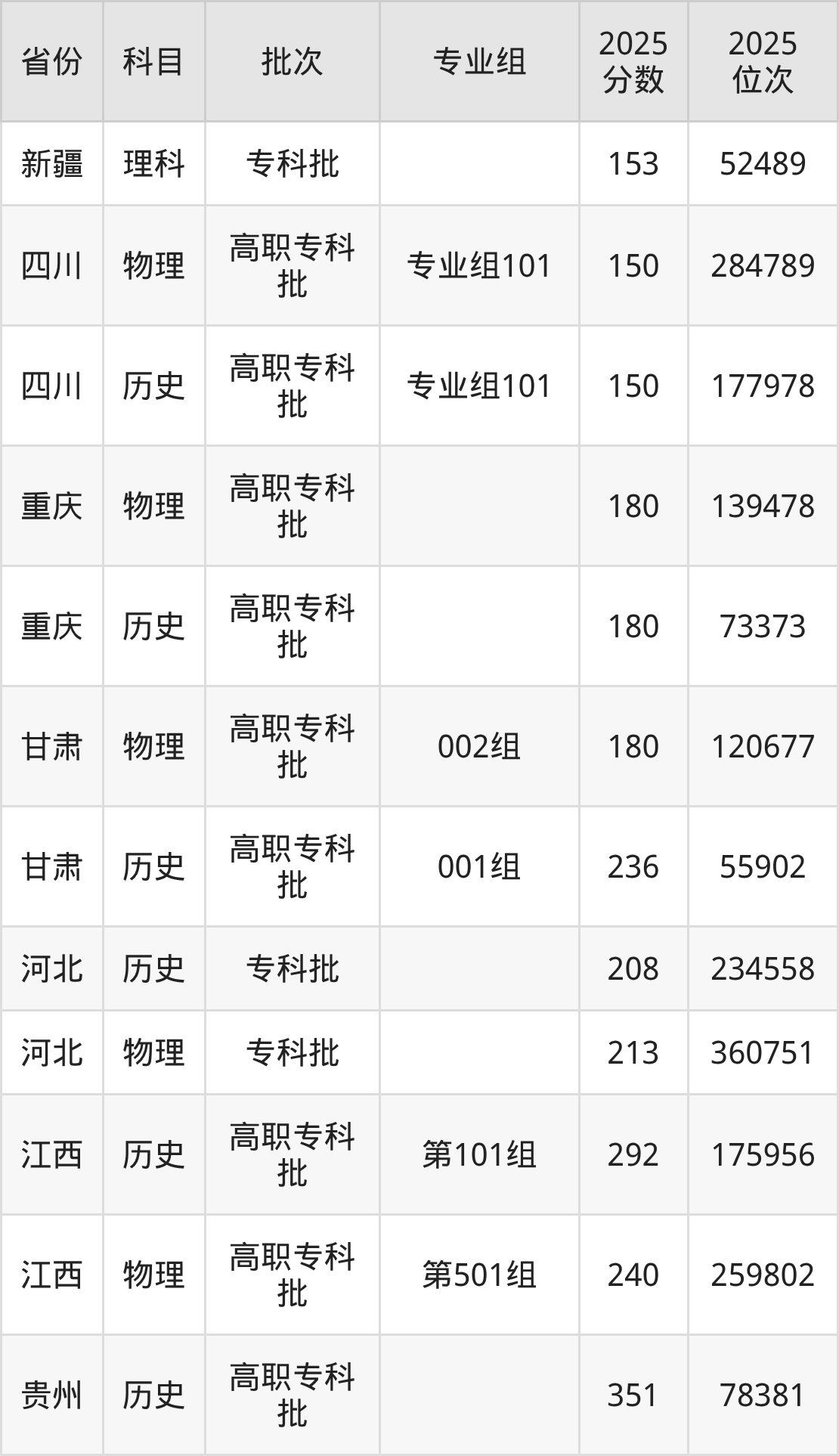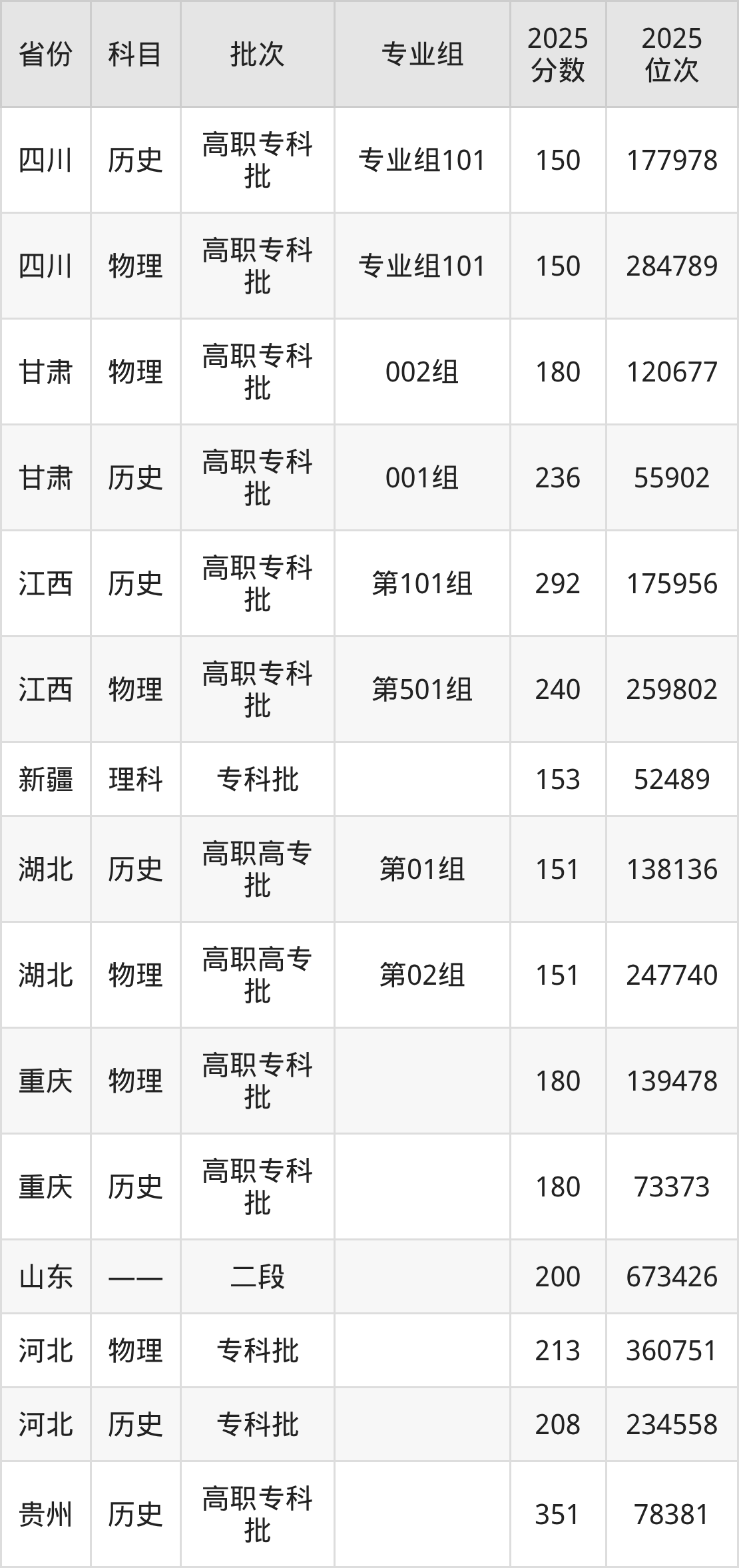 2025年在专科历史类进行招生,各专业组分数线详情如下: