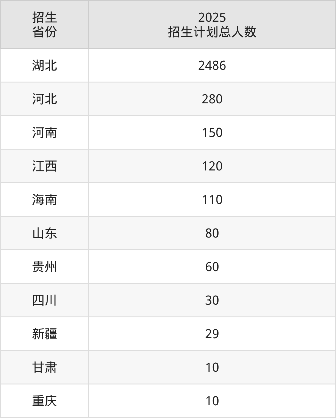 2025年湖北孝感美珈职业学院面向全国11个省市开展专科招生;招生专业共14个,招生人数共3365人。2025年在湖北省招生计划总人数是2486人,其中,湖北孝感美珈职业学院在湖北省招生人数最多的是大数据与会计。湖北孝感美珈职业学院在各省具体招生人数情况如下表。