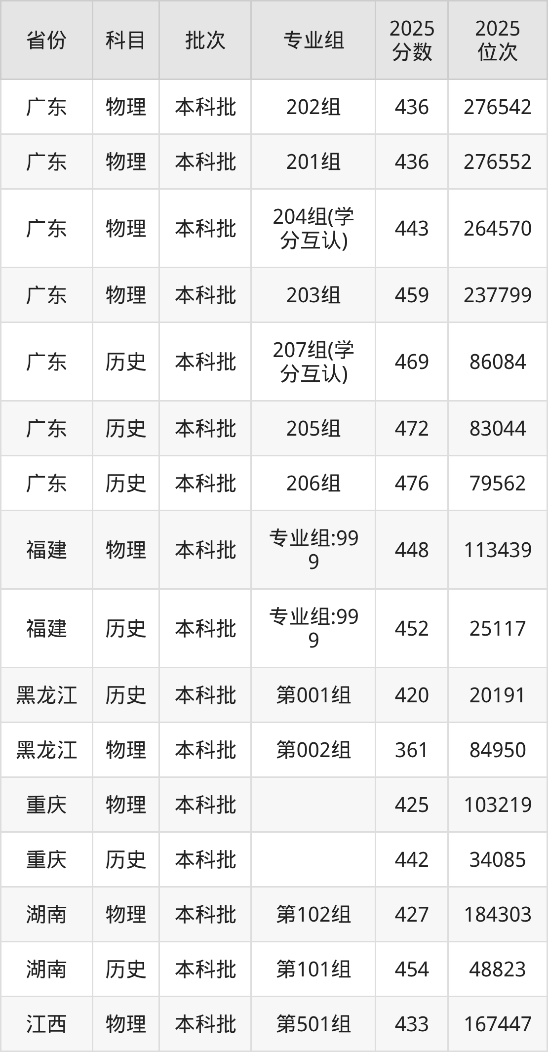 2025年在本科理科进行招生,各专业组分数线详情如下: