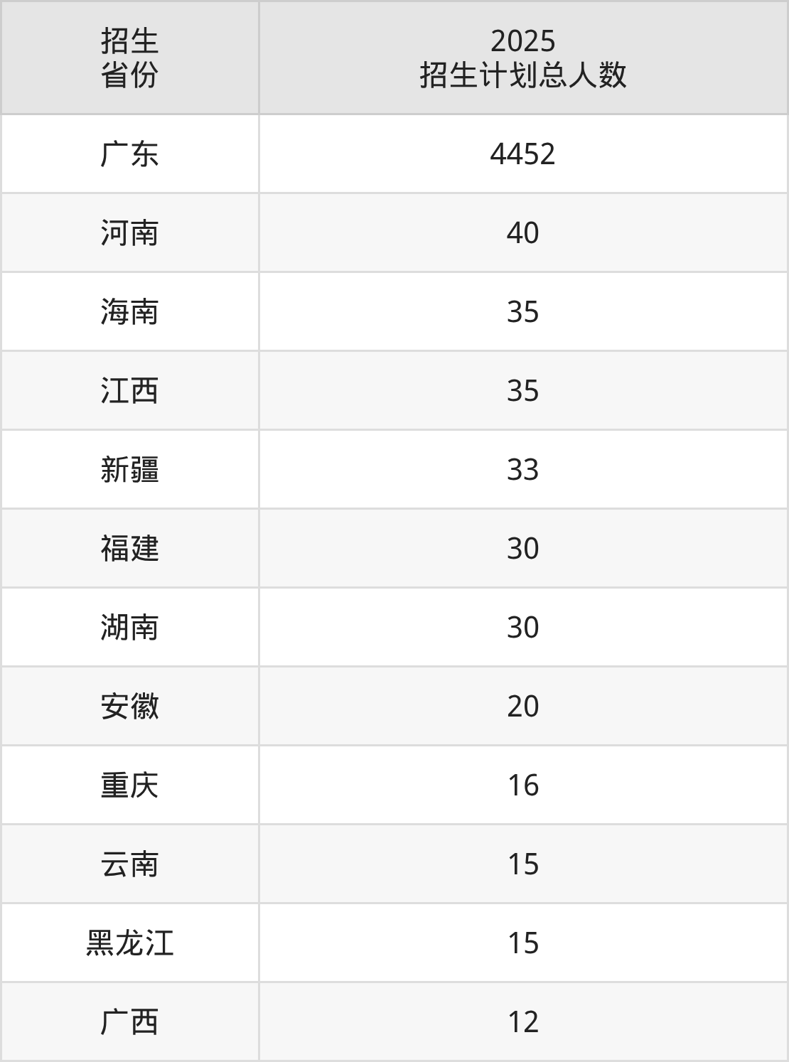 2025年广东培正学院面向全国12个省市开展本科招生;招生专业共40个,招生人数共4733人。2025年在广东省招生计划总人数是4452人,其中,广东培正学院在广东省招生人数最多的是数据科学与大数据技术。广东培正学院在各省具体招生人数情况如下表。