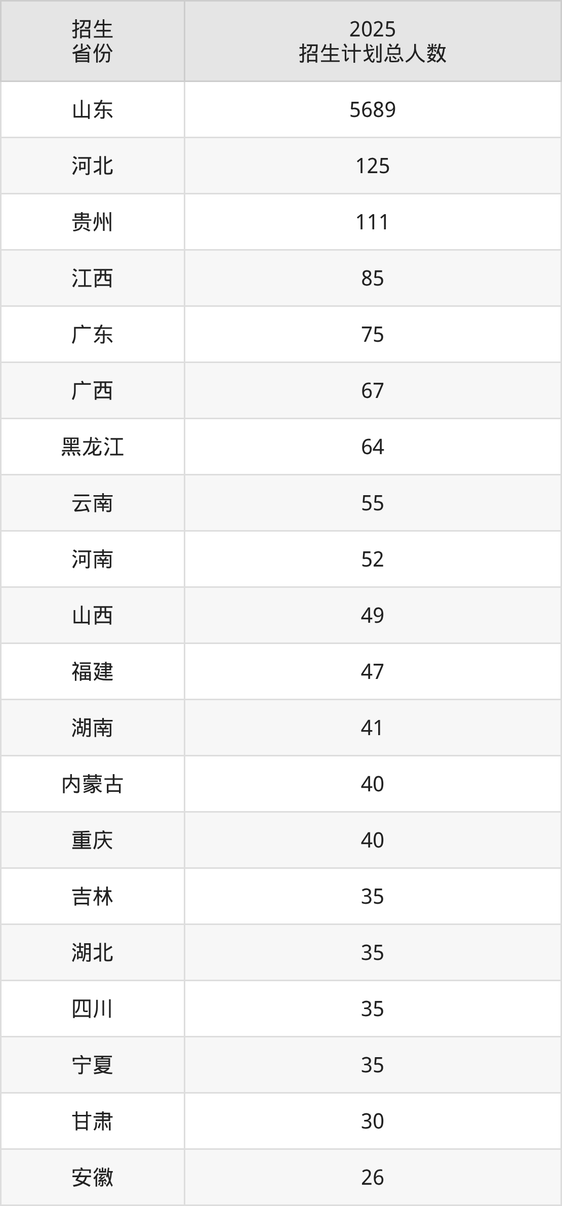 2025年青岛农业大学面向全国28个省市开展本科招生;招生专业共61个,招生人数共6875人。2025年在山东省招生计划总人数是5689人,其中,青岛农业大学在山东省招生人数最多的是计算机科学与技术。青岛农业大学在各省具体招生人数情况如下表。