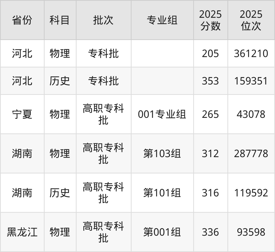 2025年在专科物理类进行招生,各专业组分数线详情如下: