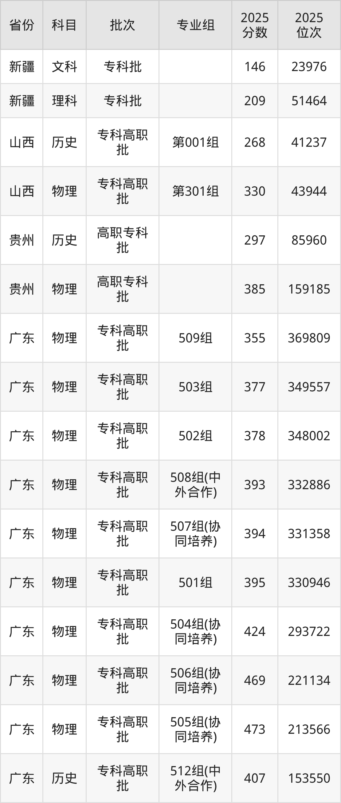 2025年广东工程职业技术学院全国录取分数线是146分到473分,录取最低在新疆文科、录取最高在广东物理类(505组(协同培养))。各省各专业组最低分具有差异,详情如下: