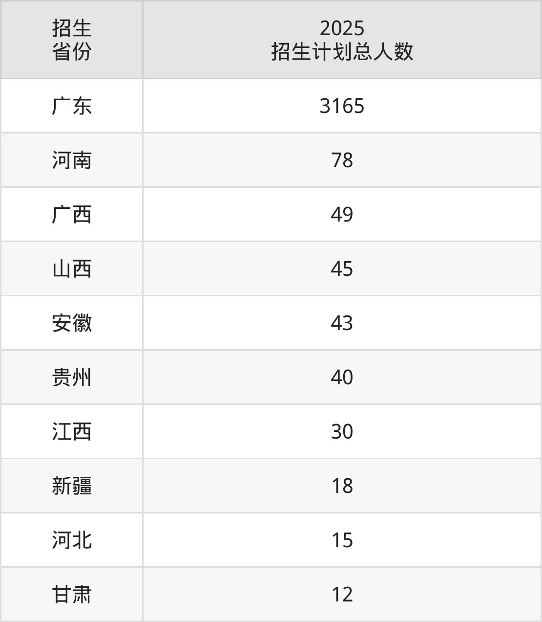 2025年广东工程职业技术学院面向全国10个省市开展专科招生;招生专业共39个,招生人数共3495人。2025年在广东省招生计划总人数是3165人,其中,广东工程职业技术学院在广东省招生人数最多的是软件技术。广东工程职业技术学院在各省具体招生人数情况如下表。