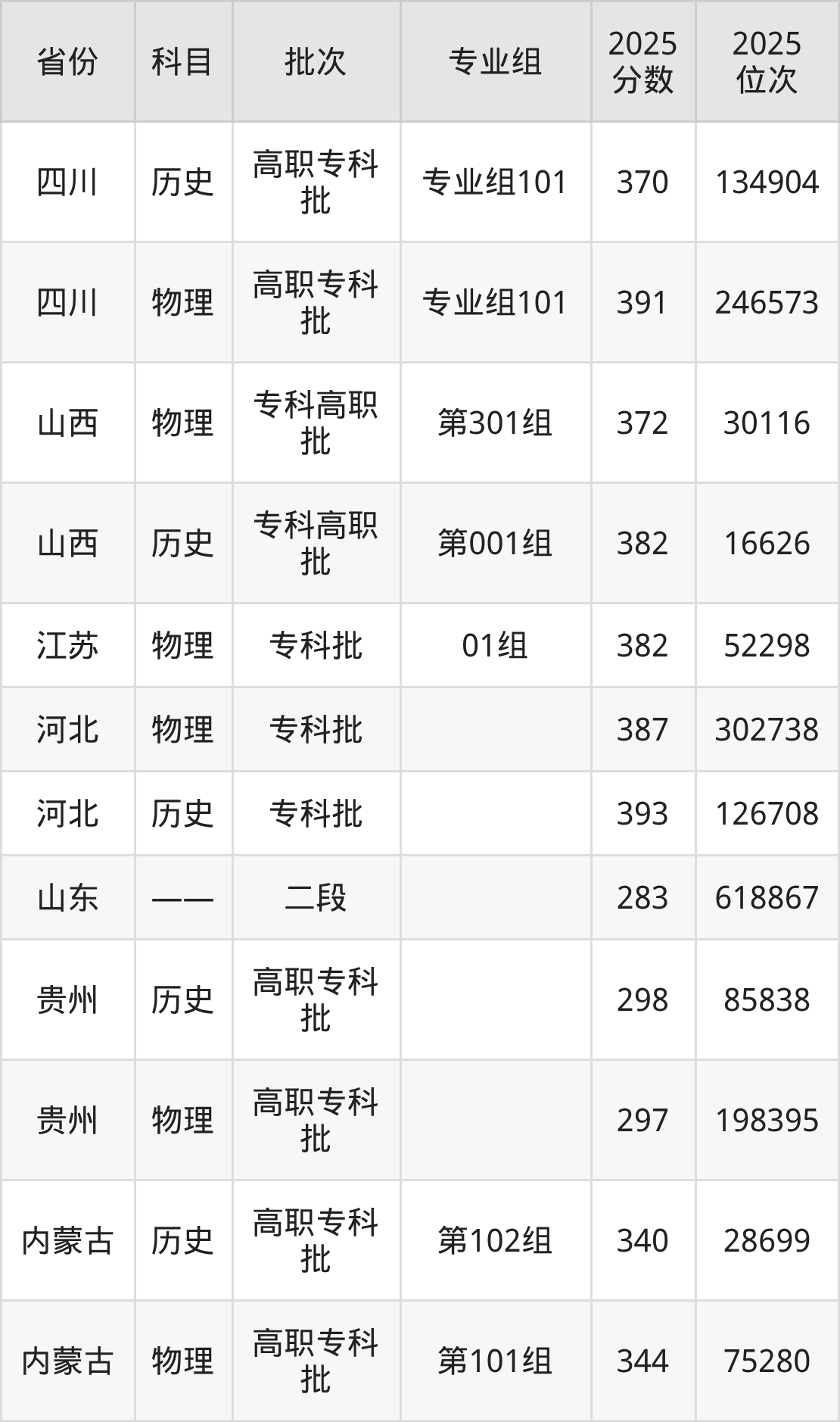 2025年在专科物理类进行招生,各专业组分数线详情如下: