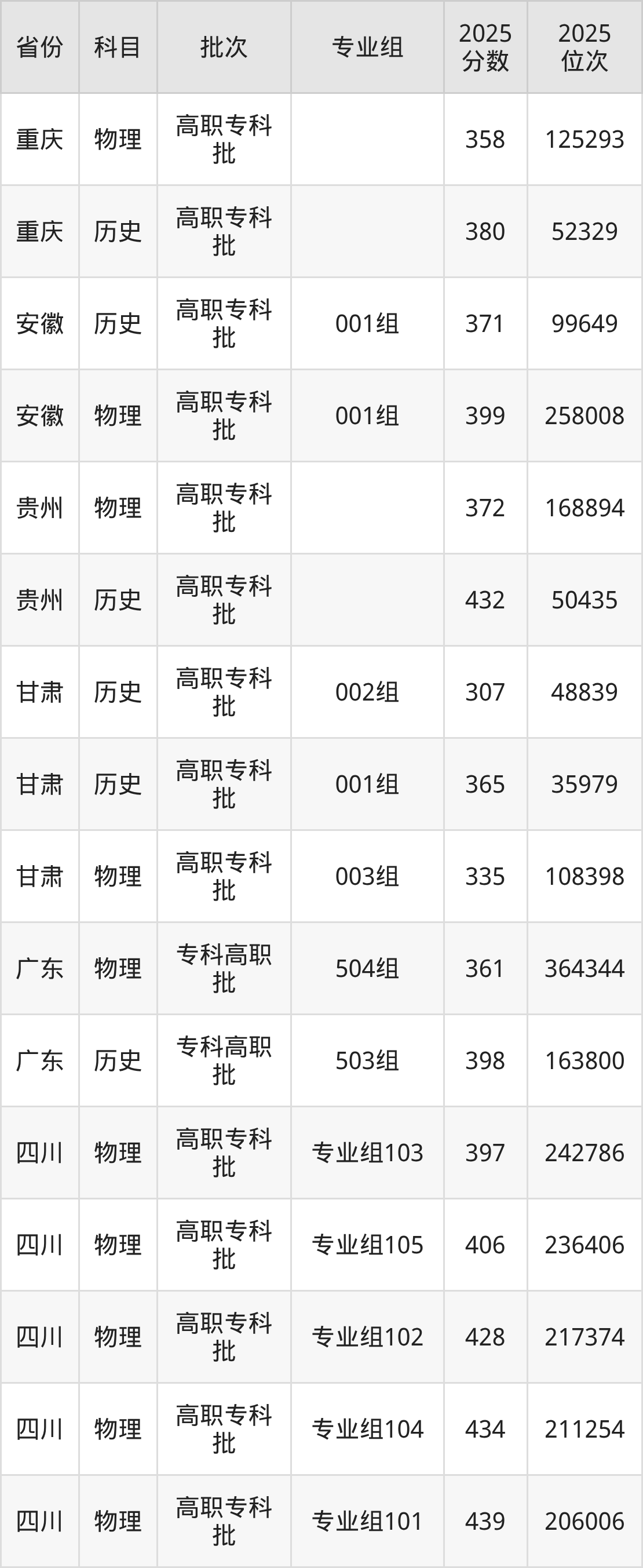 四川职业技术学院003专业组:2025年投档录取最低分为335分,录取最低位次为108398名。