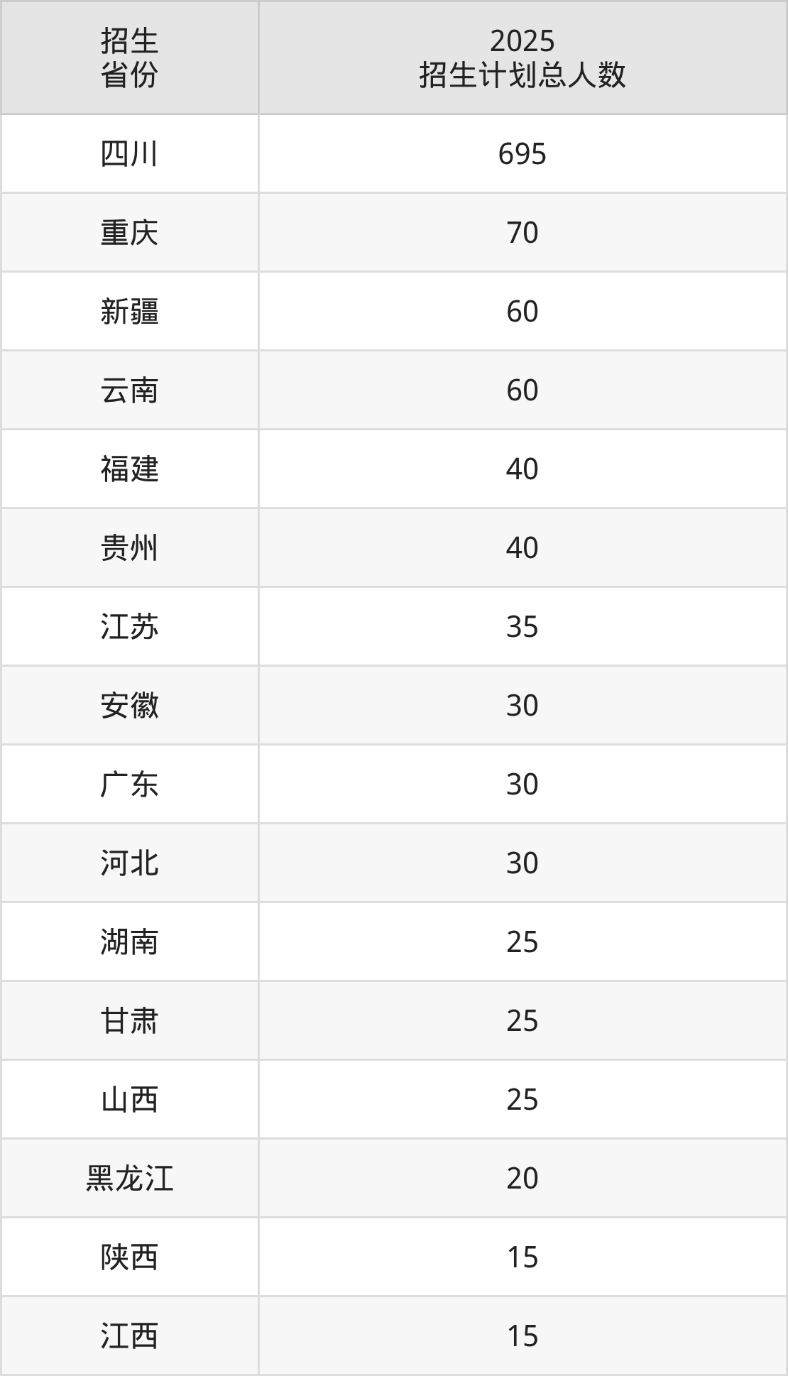 2025年四川职业技术学院面向全国16个省市开展专科招生;招生专业共49个,招生人数共1215人。2025年在四川省招生计划总人数是695人,其中,四川职业技术学院在四川省招生人数最多的是软件技术。四川职业技术学院在各省具体招生人数情况如下表。