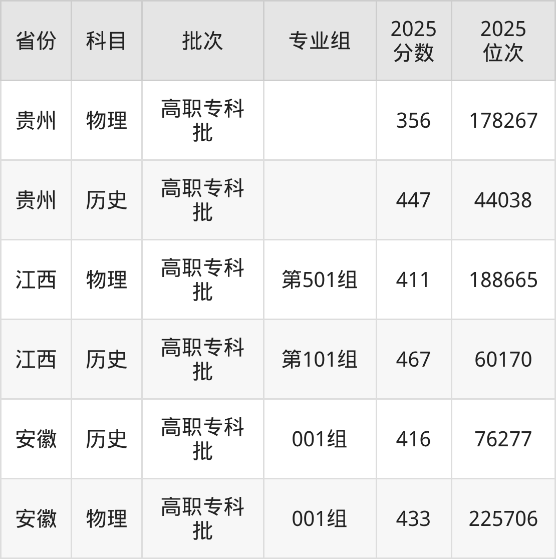 普通类专科物理类最低356分,专科历史类最低447分