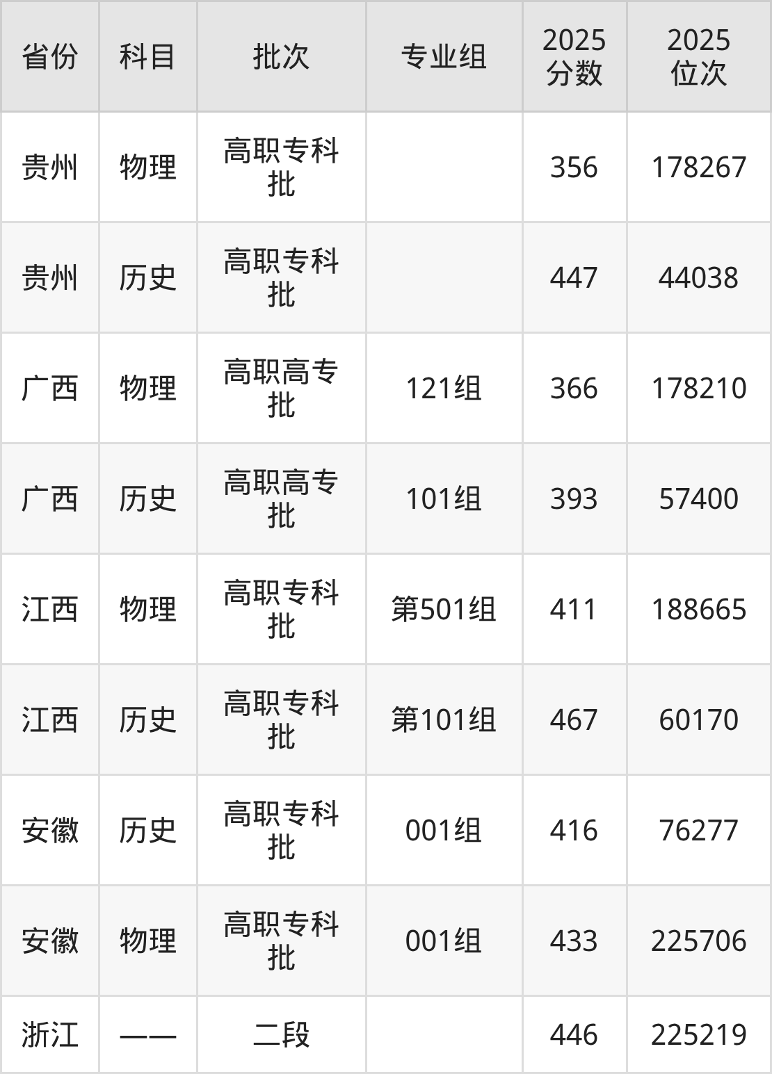 2025年丽水职业技术学院全国录取分数线是356分到471分,录取最低在贵州物理类、录取最高在浙江。各省各专业组最低分具有差异,详情如下: