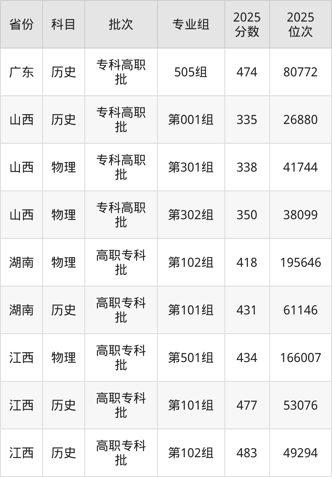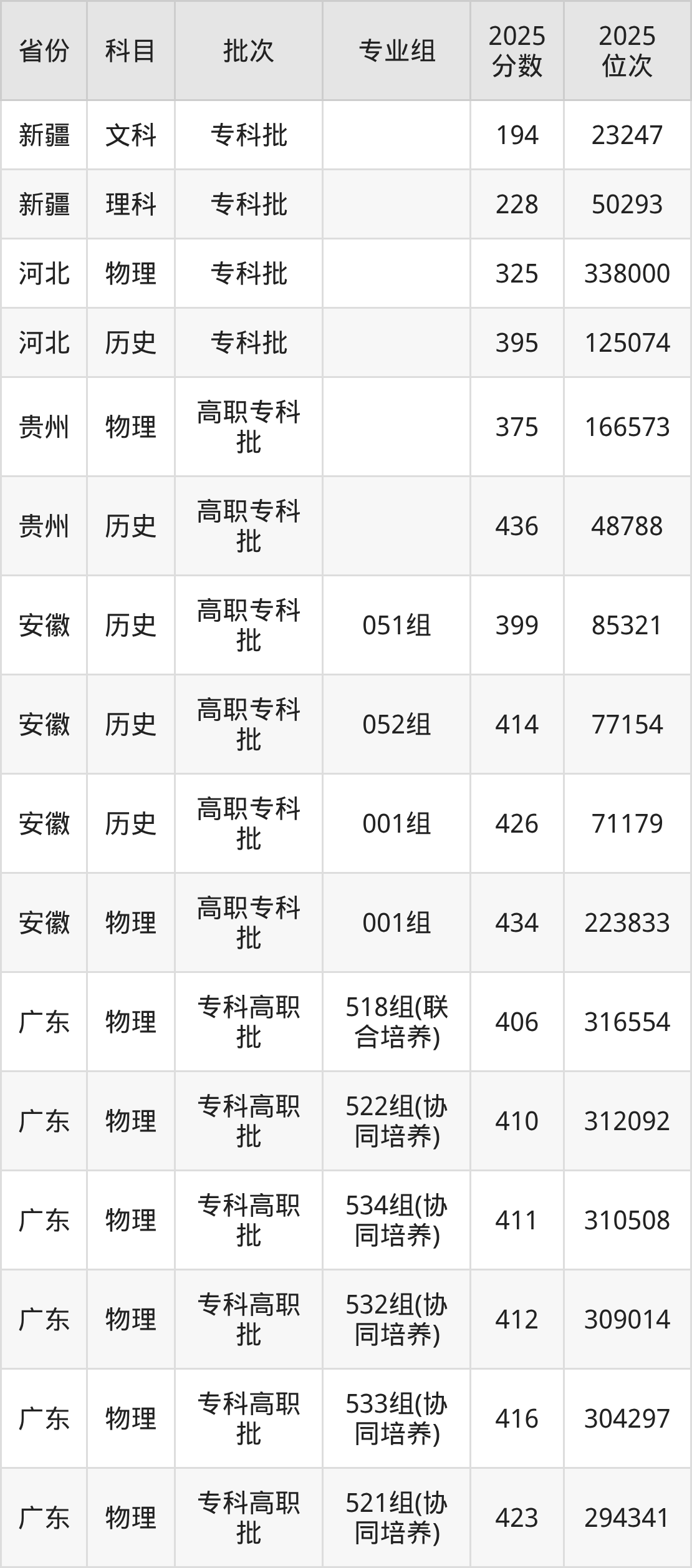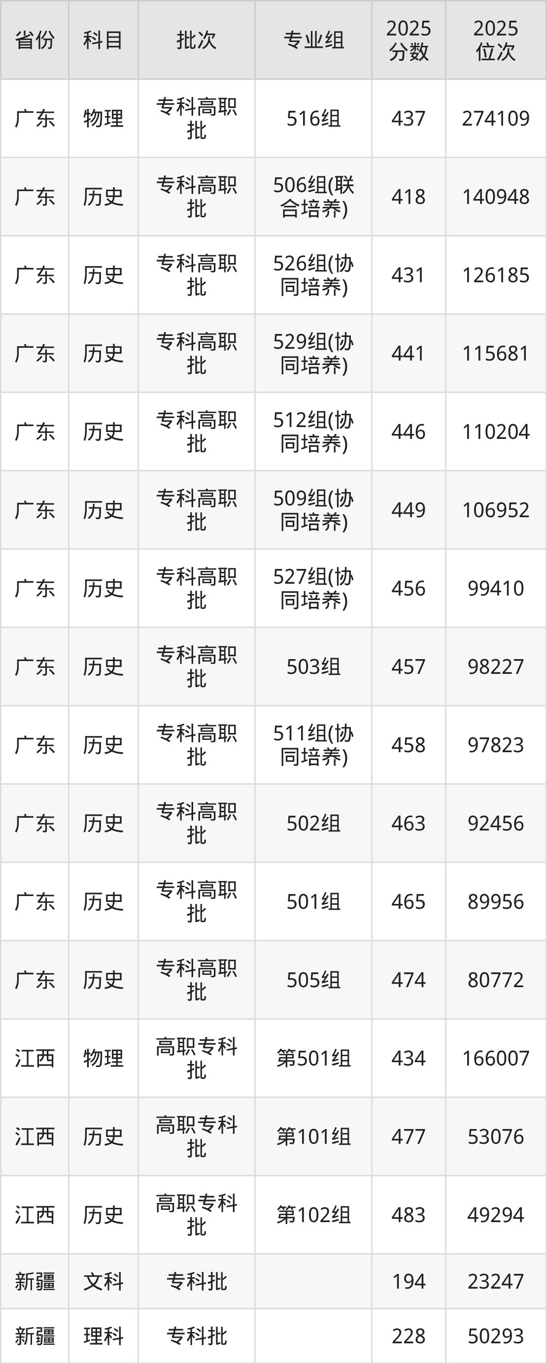 2025年东莞职业技术学院全国录取分数线是194分到483分,录取最低在新疆文科、录取最高在江西历史类(第102组)。各省各专业组最低分具有差异,详情如下: