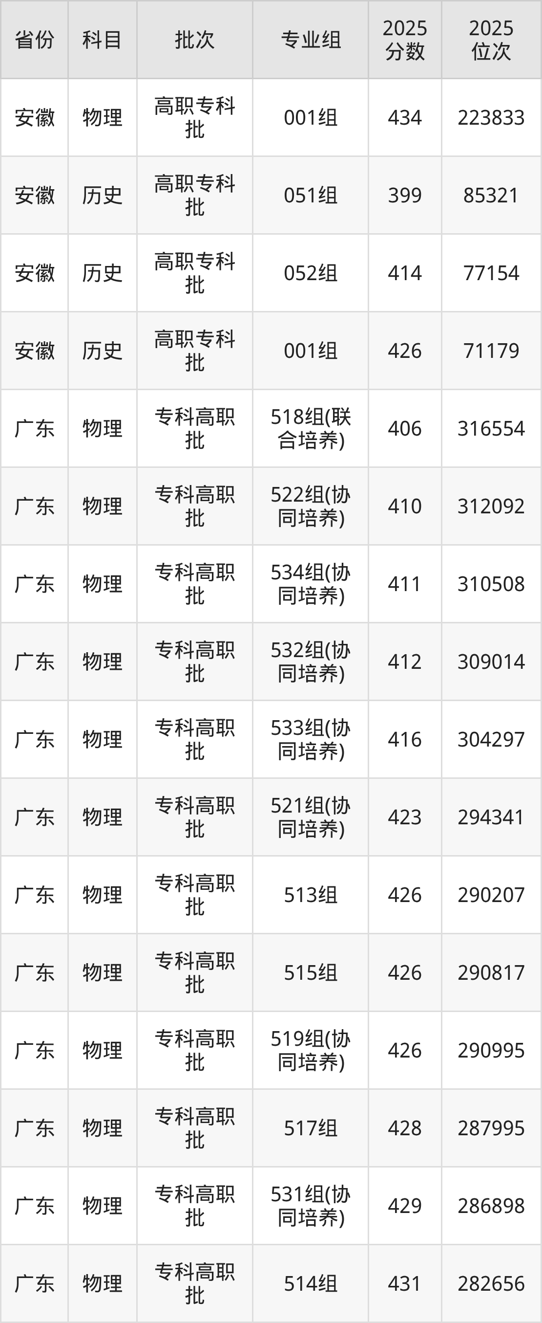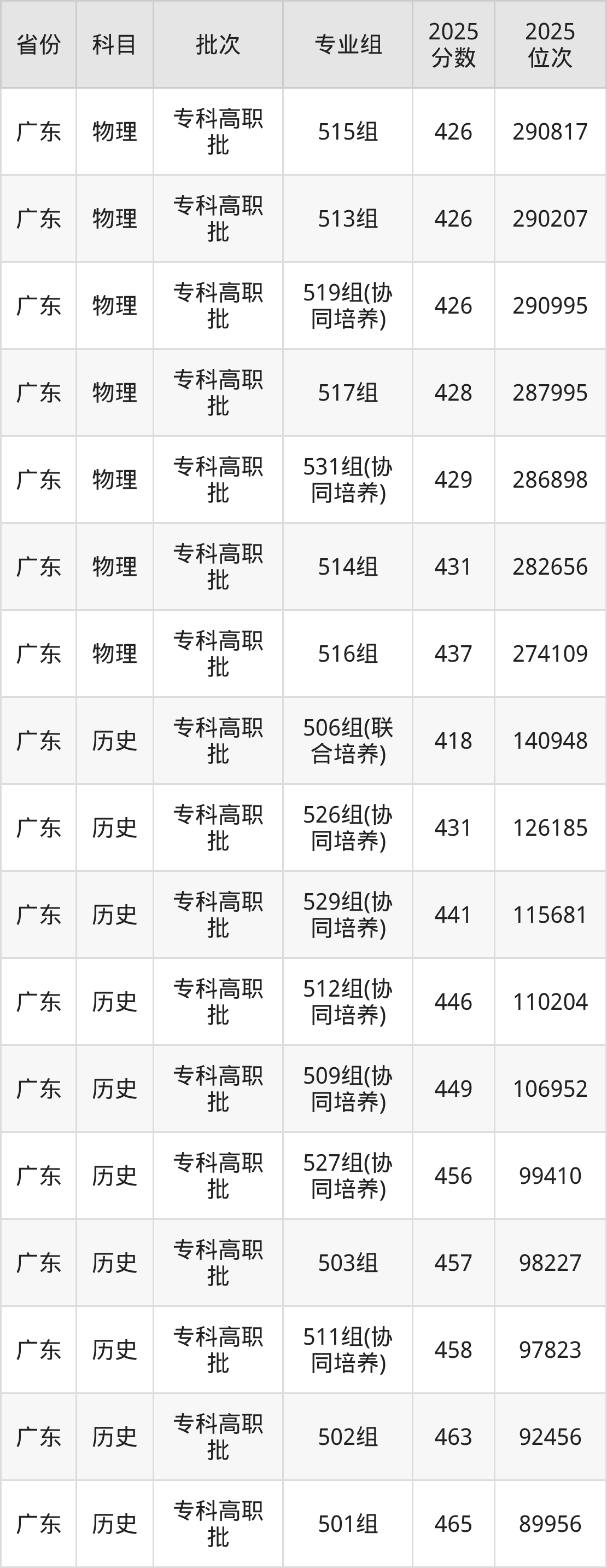 东莞职业技术学院519组(协同培养):2025年投档录取最低分为426分,录取最低位次为290995名。