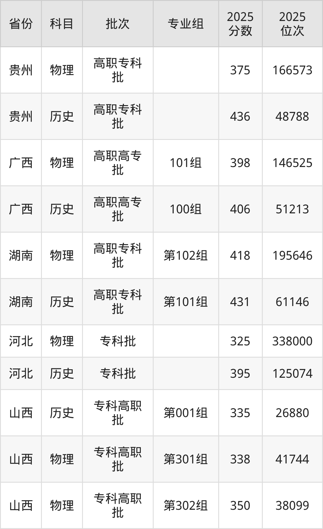 2025年投档录取最低分为325分,录取最低位次为338000名。