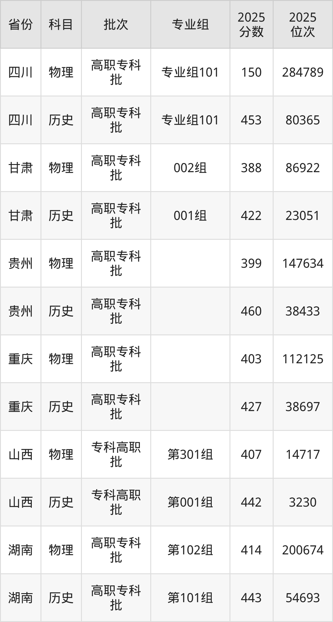 2025年四川护理职业学院全国录取分数线是150分到460分,录取最低在四川物理类(专业组101)、录取最高在贵州历史类。各省各专业组最低分具有差异,详情如下: