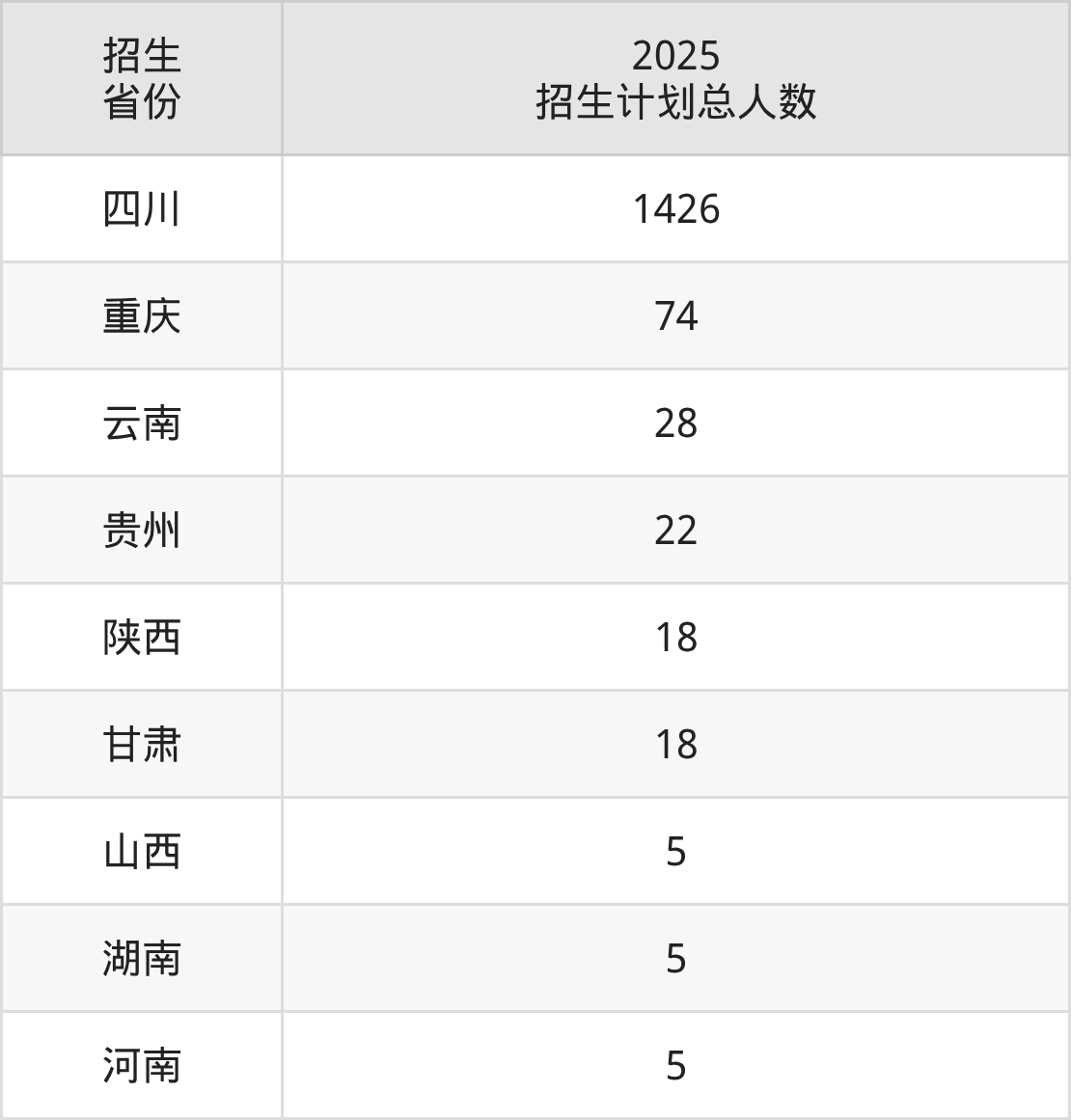 2025年四川护理职业学院面向全国9个省市开展专科招生;招生专业共15个,招生人数共1601人。2025年在四川省招生计划总人数是1426人,其中,四川护理职业学院在四川省招生人数最多的是护理。四川护理职业学院在各省具体招生人数情况如下表。