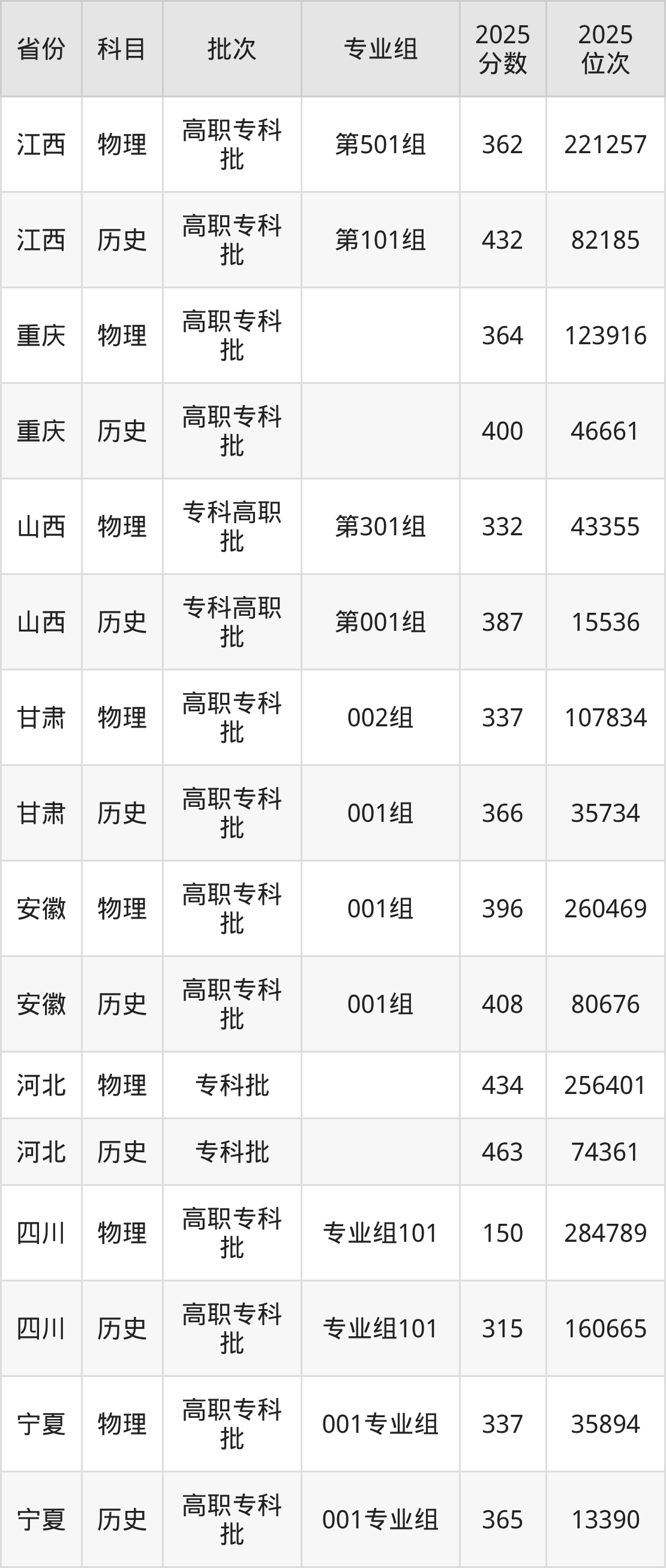2025年咸阳职业技术学院全国录取分数线是150分到471分,录取最低在四川物理类(专业组101)、录取最高在河北历史类。各省各专业组最低分具有差异,详情如下: