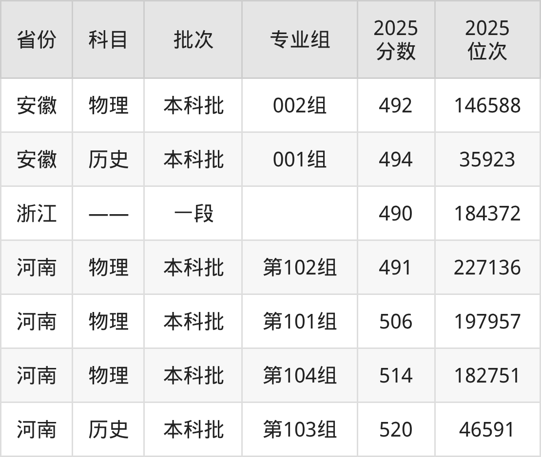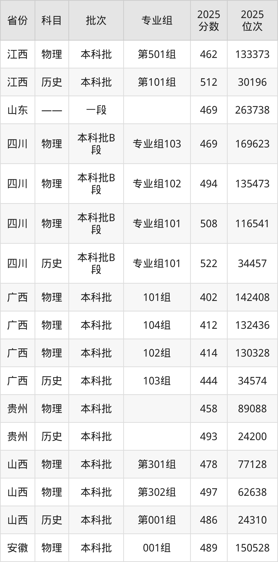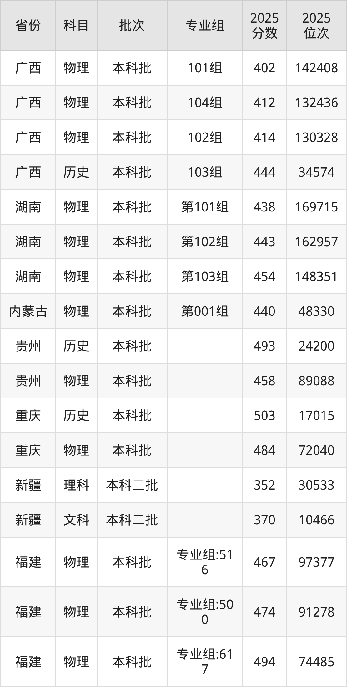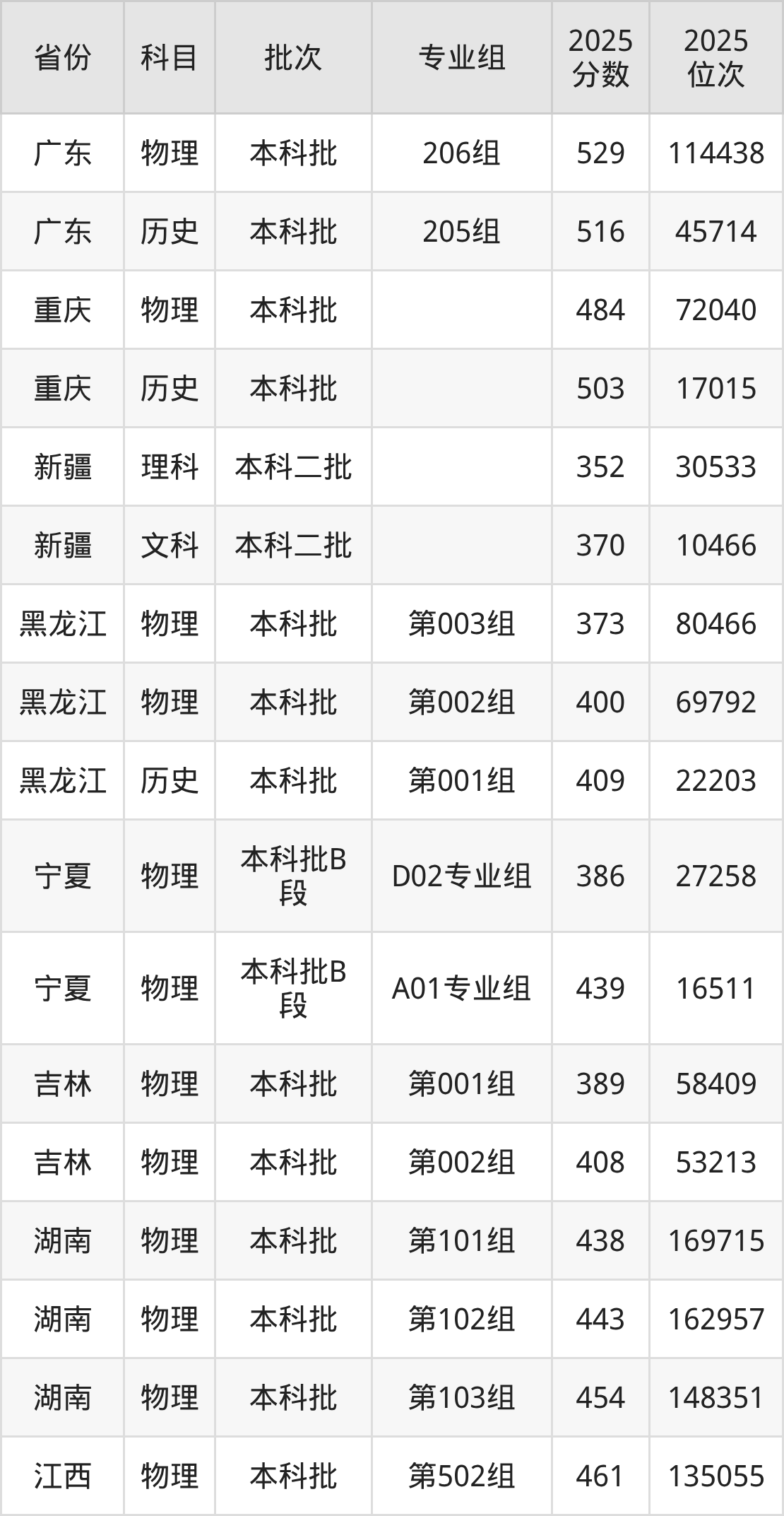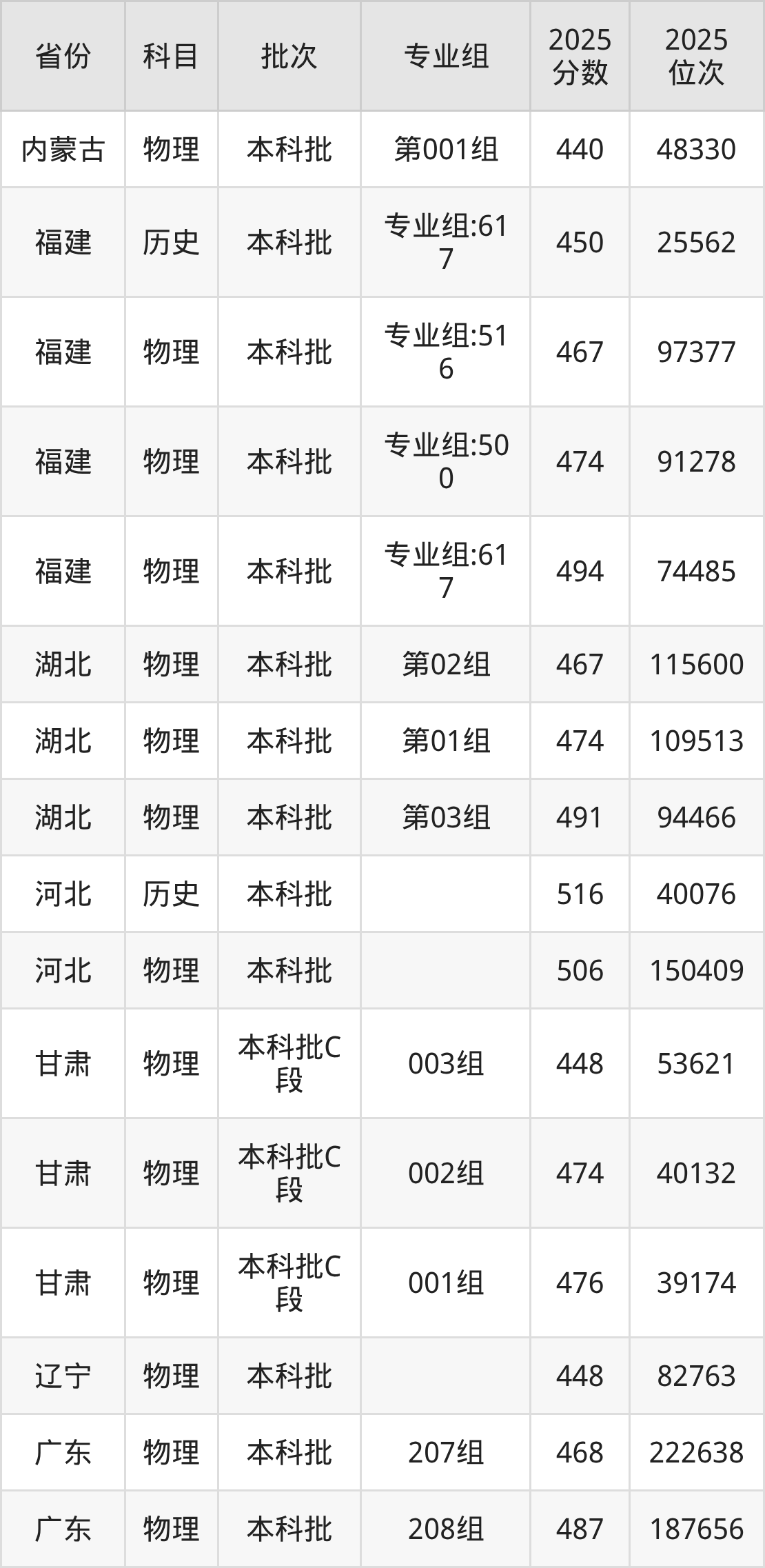 2025年在本科物理类进行招生,各专业组分数线详情如下: