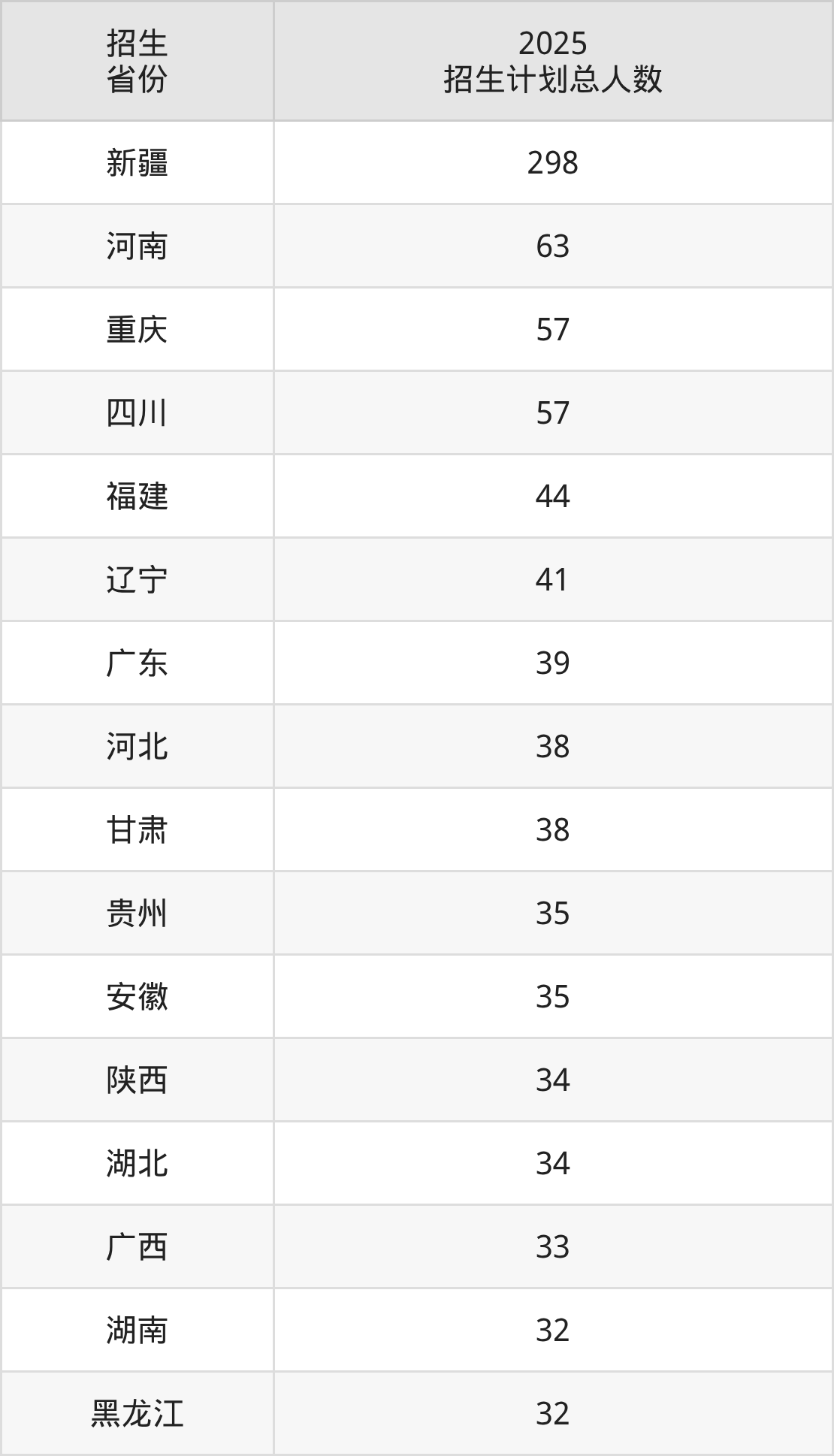 2025年新疆第二医学院面向全国23个省市开展本科招生;招生专业共14个,招生人数共1071人。2025年在新疆维吾尔自治区招生计划总人数是298人,其中,新疆第二医学院在新疆维吾尔自治区招生人数最多的是临床医学。新疆第二医学院在各省具体招生人数情况如下表。