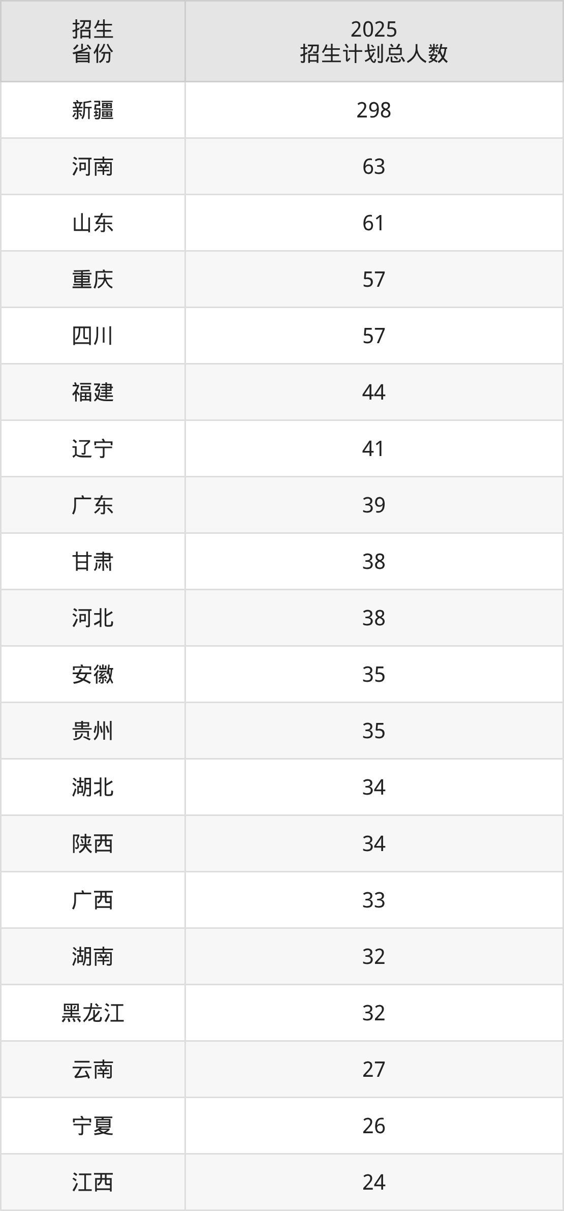 2025年新疆第二医学院面向全国24个省市开展本科招生;招生专业共14个,招生人数共1132人。2025年在新疆维吾尔自治区招生计划总人数是298人,其中,新疆第二医学院在新疆维吾尔自治区招生人数最多的是临床医学。新疆第二医学院在各省具体招生人数情况如下表。