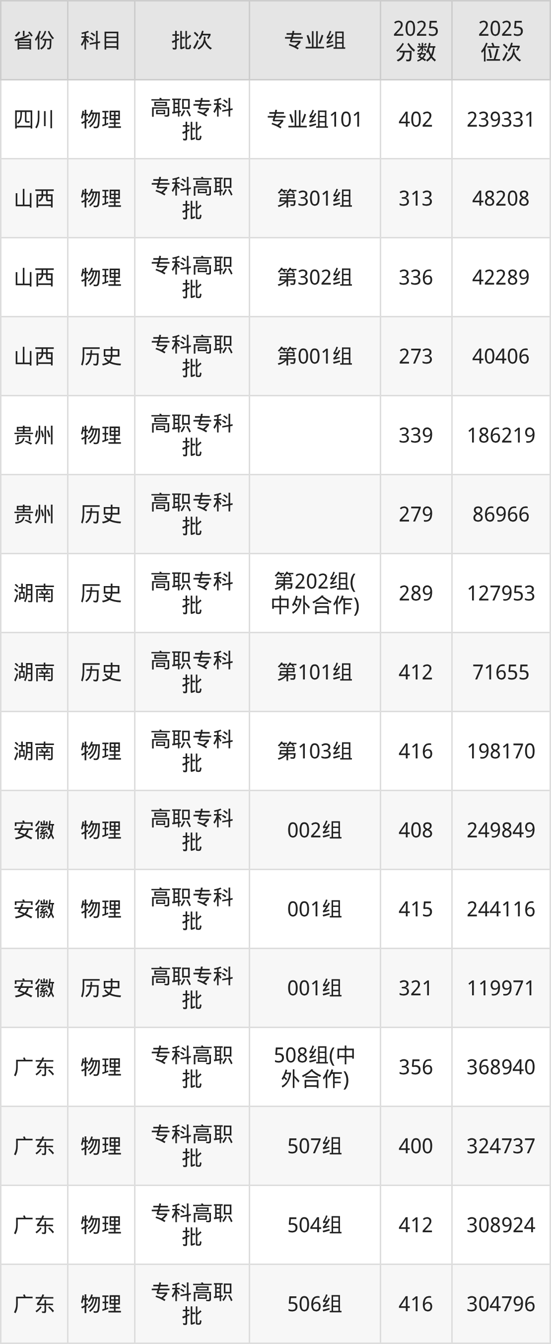 普通类专科物理类最低402分,专科历史类最低461分
