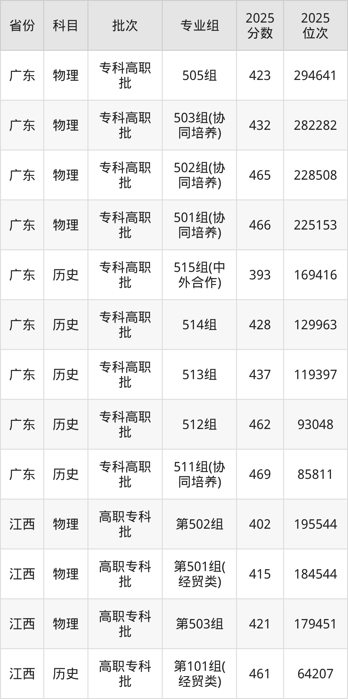 中山职业技术学院501组(协同培养):2025年投档录取最低分为466分,录取最低位次为225153名。