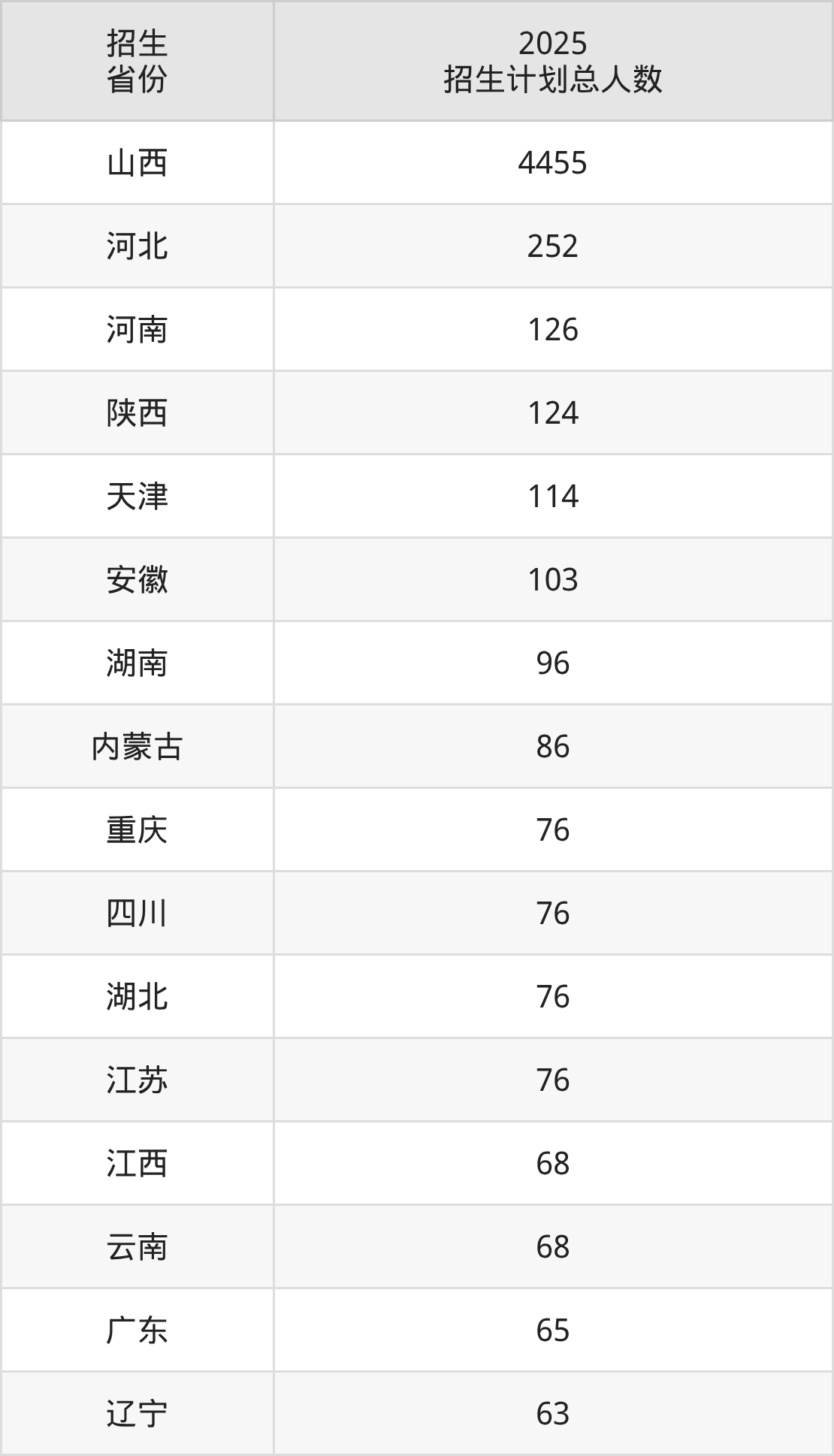 2025年山西农业大学面向全国28个省市开展本科招生;招生专业共61个,招生人数共6253人。2025年在山西省招生计划总人数是4455人,其中,山西农业大学在山西省招生人数最多的是软件工程。山西农业大学在各省具体招生人数情况如下表。