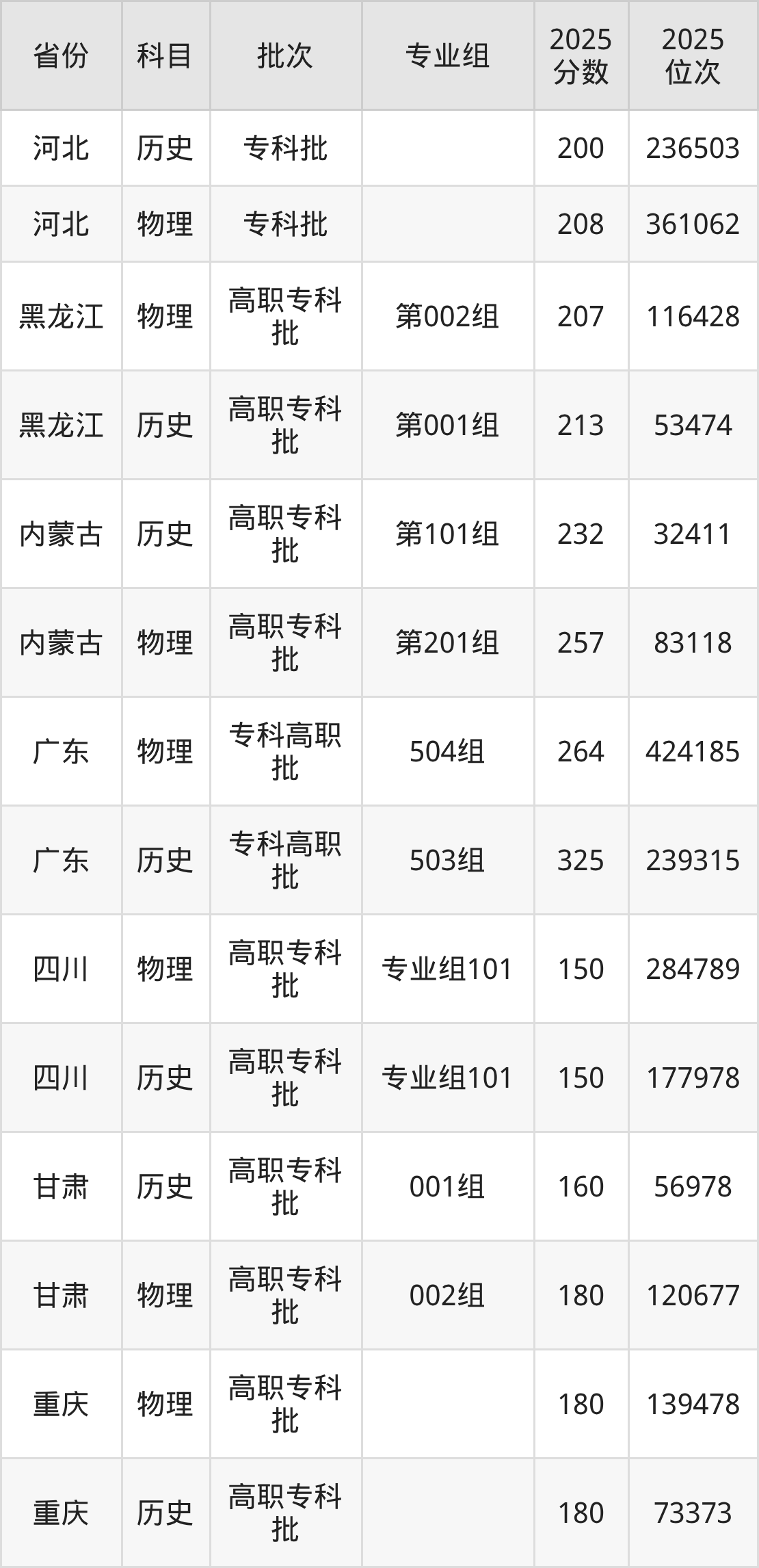 四川应用技术职业学院002专业组:2025年投档录取最低分为180分,录取最低位次为120677名。