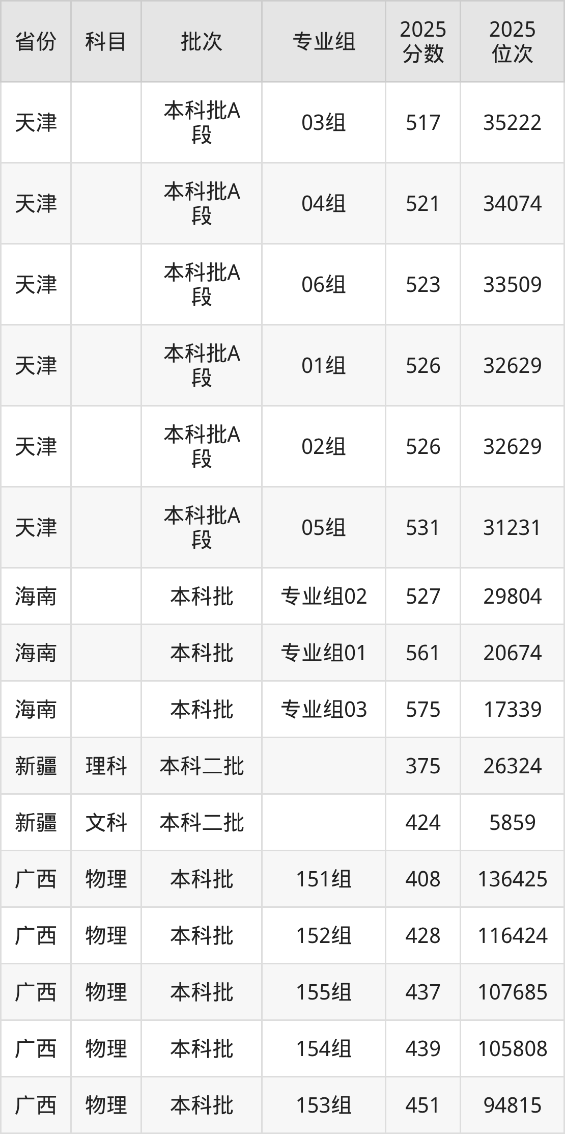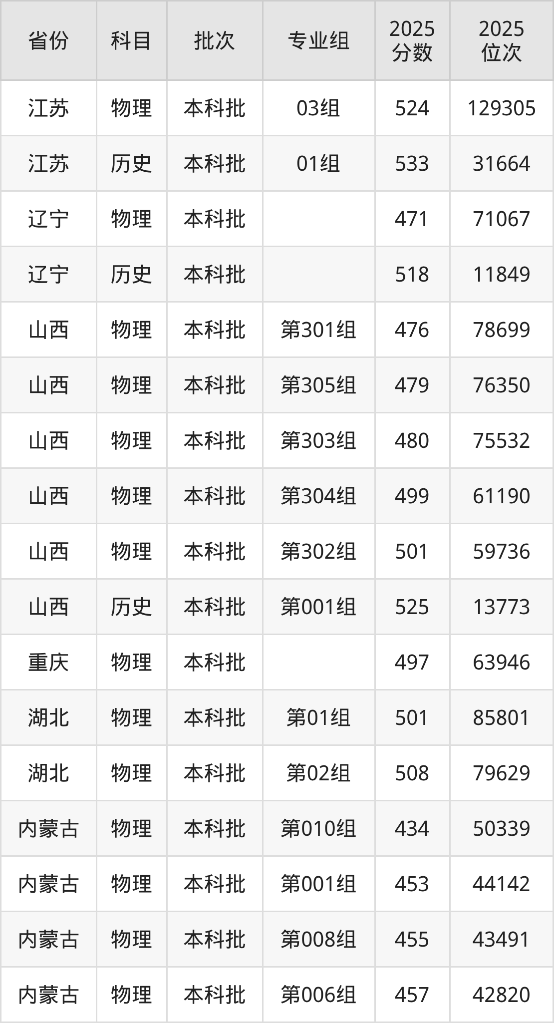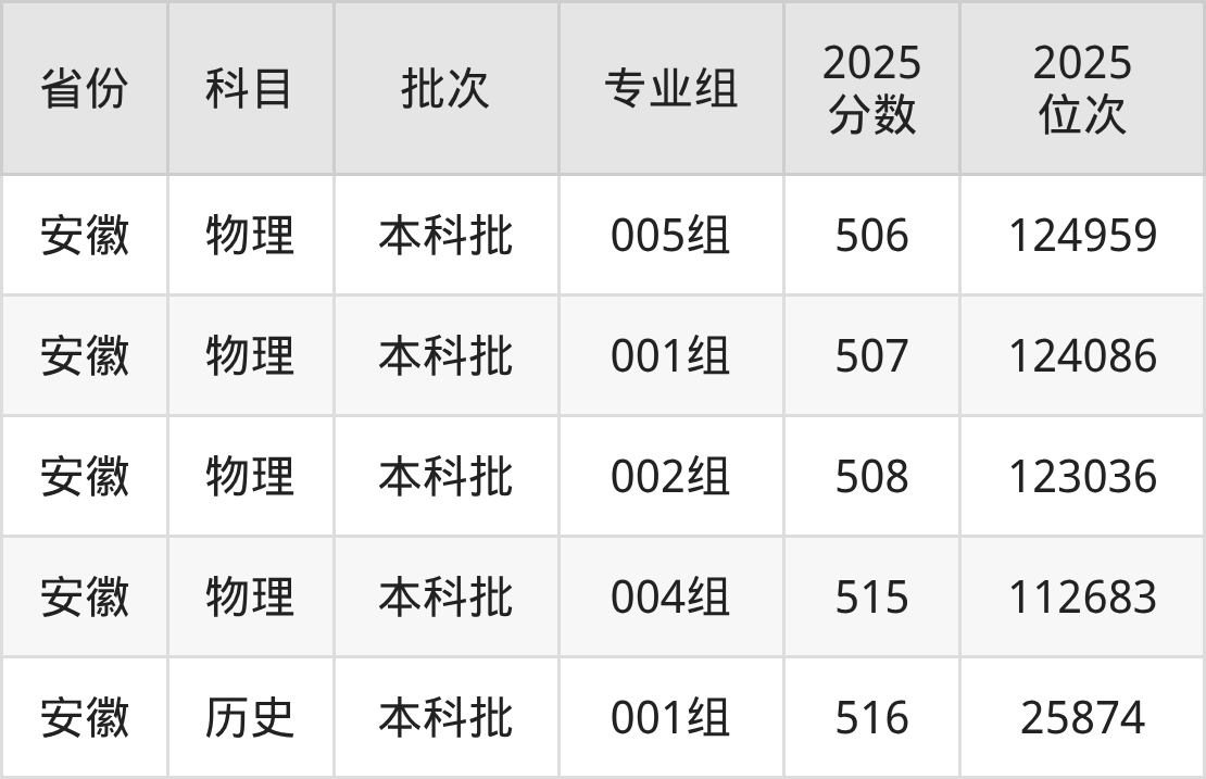 2025年在本科物理类进行招生,各专业组分数线详情如下: