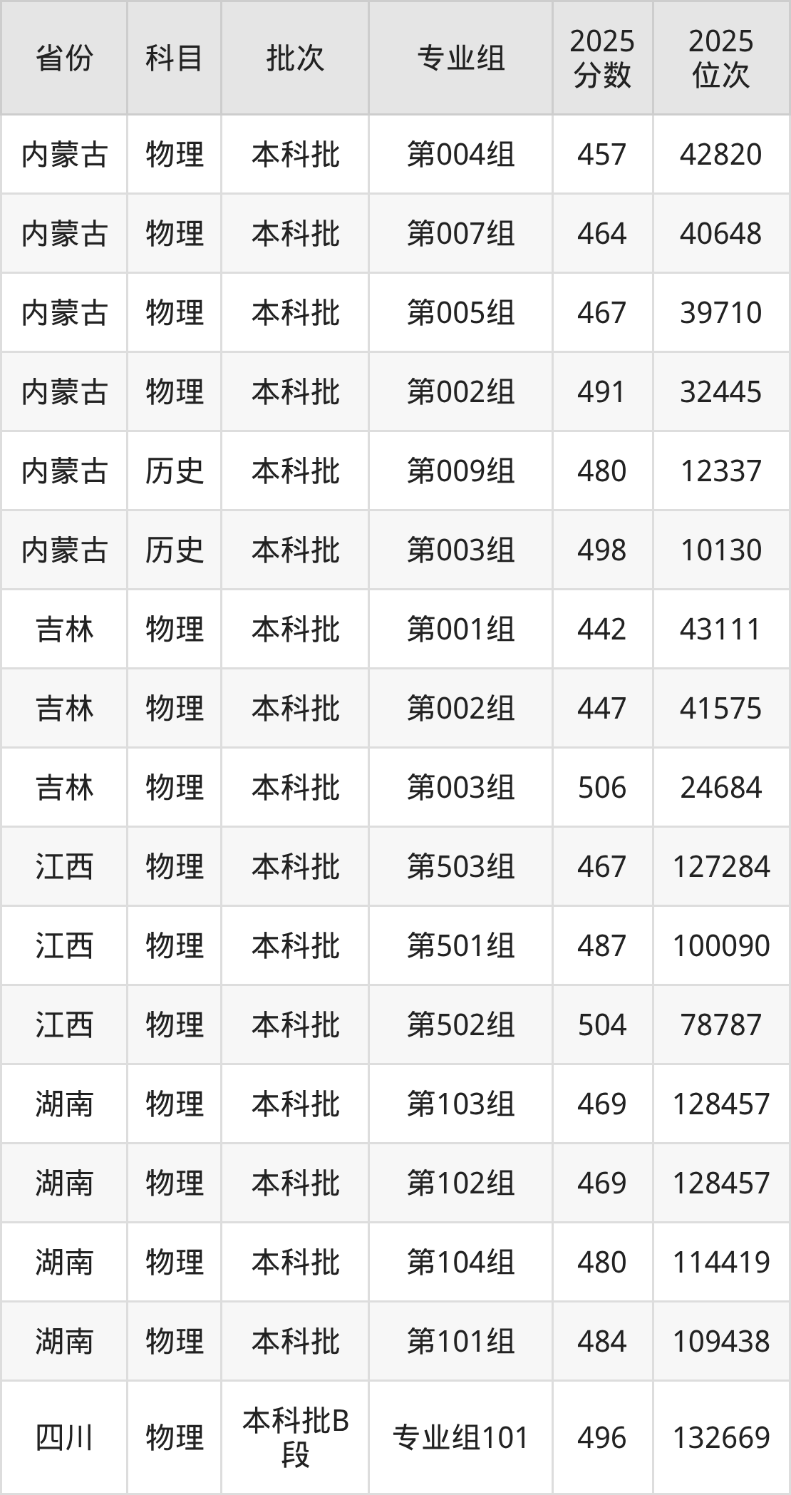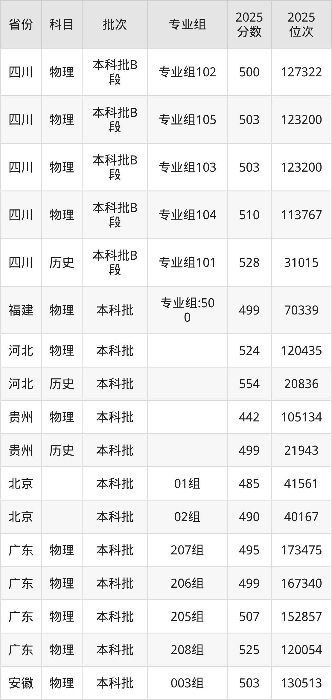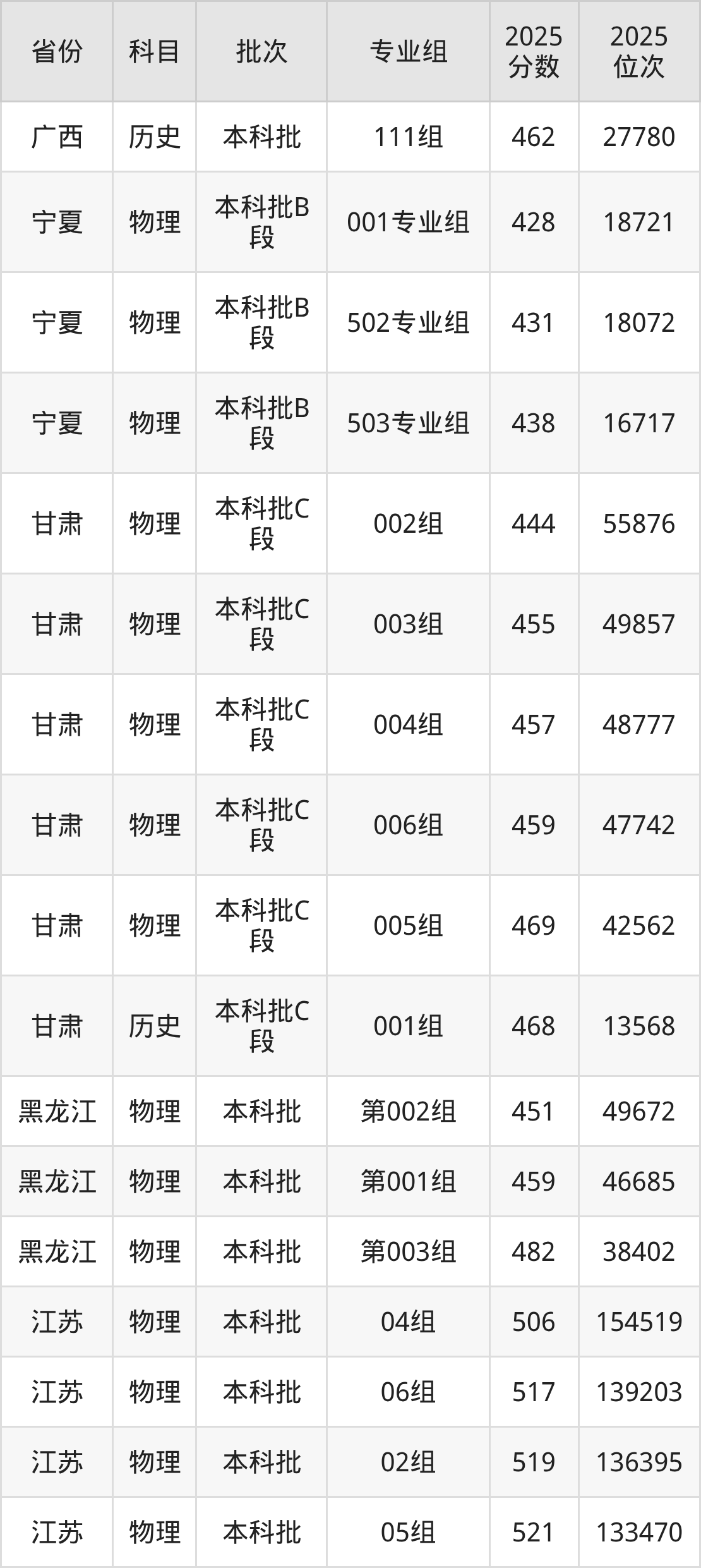 2025年在本科物理类进行招生,各专业组分数线详情如下: