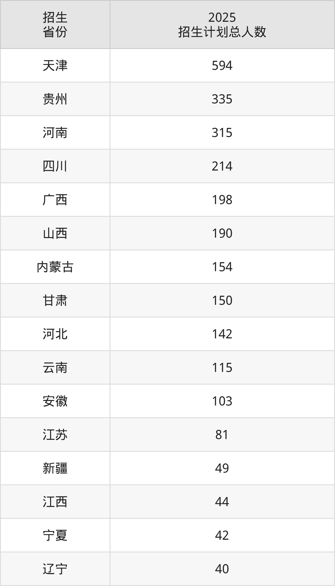 2025年天津农学院面向全国27个省市开展本科招生;招生专业共47个,招生人数共3002人。2025年在天津市招生计划总人数是594人,其中,天津农学院在天津市招生人数最多的是软件工程。天津农学院在各省具体招生人数情况如下表。