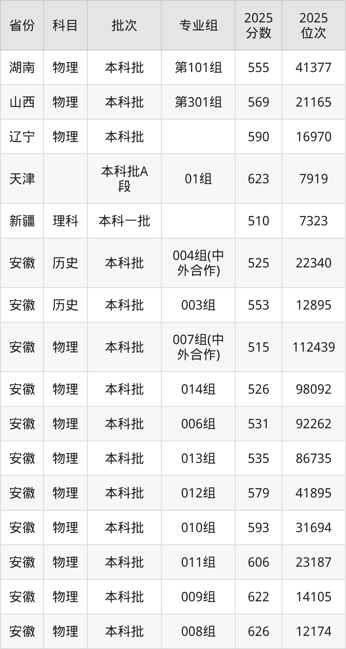 安徽医科大学007组(中外合作办学):2025年投档录取最低分为515分,录取最低位次为112439名。