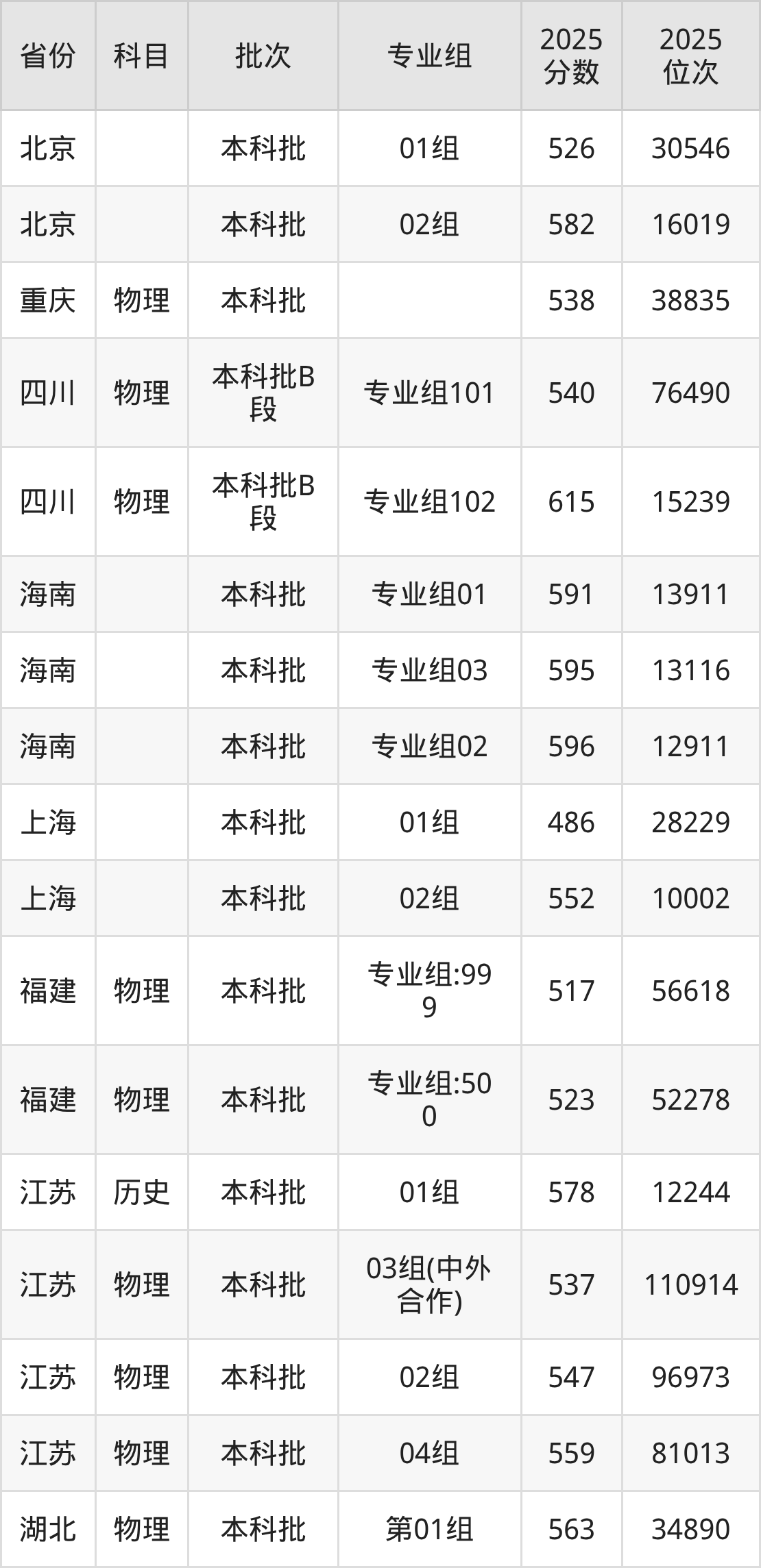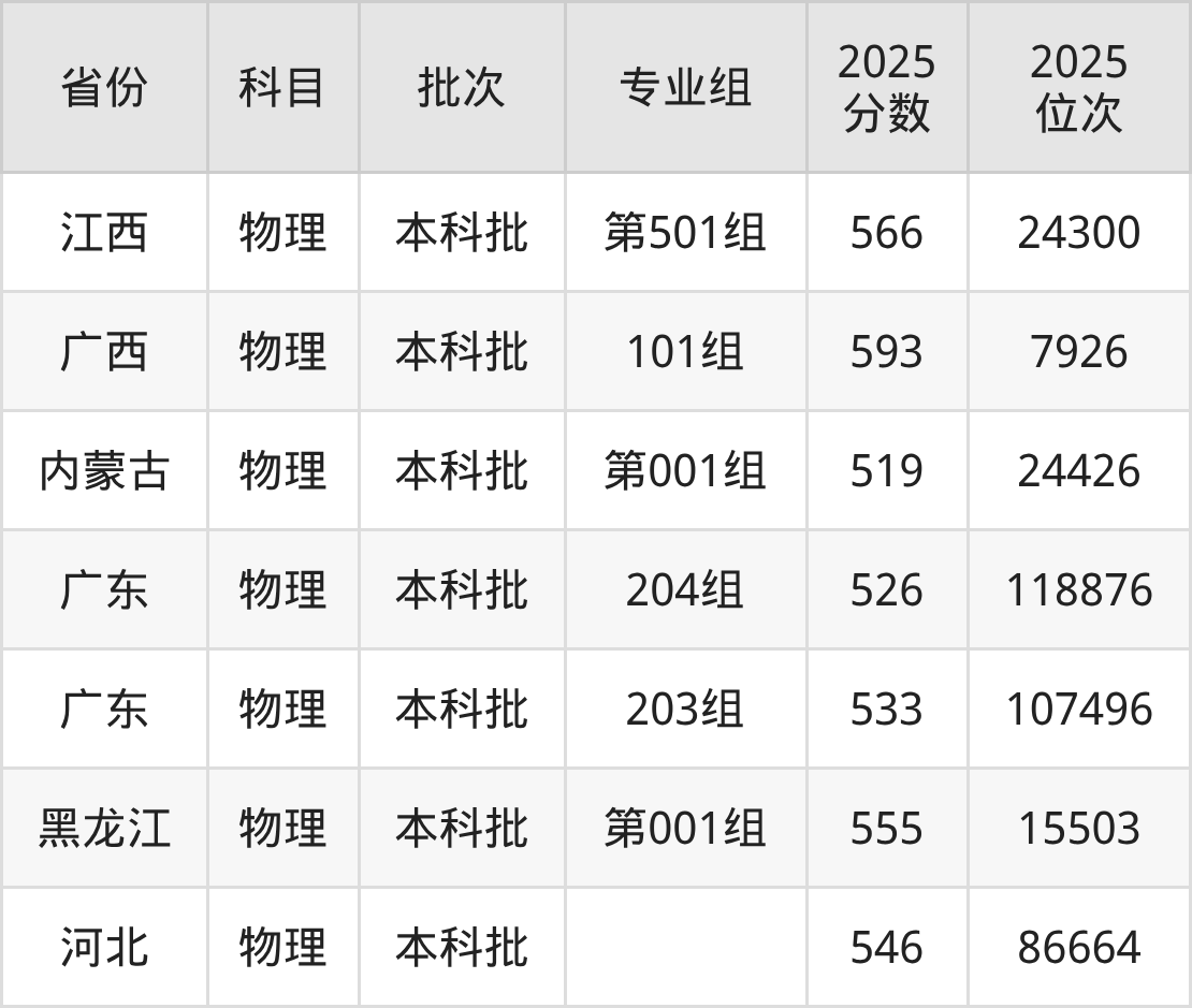 2025年在本科物理类进行招生,各专业组分数线详情如下: