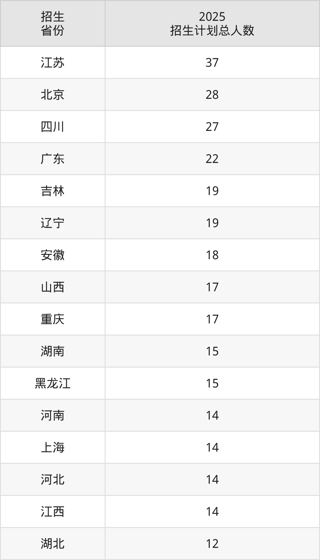2025年中国人民大学(苏州校区)面向全国22个省市开展本科招生;招生专业共7个,招生人数共337人。2025年在江苏省招生计划总人数是37人,其中,中国人民大学(苏州校区)在江苏省招生人数最多的是金融学。中国人民大学(苏州校区)在各省具体招生人数情况如下表。