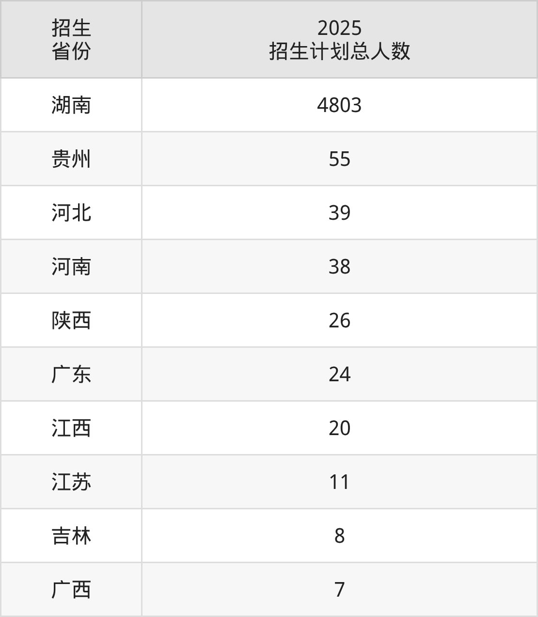 2025年张家界学院面向全国10个省市开展本科招生;招生专业共27个,招生人数共3595人。2025年在湖南省招生计划总人数是4803人,其中,张家界学院在湖南省招生人数最多的是助产。张家界学院在各省具体招生人数情况如下表。