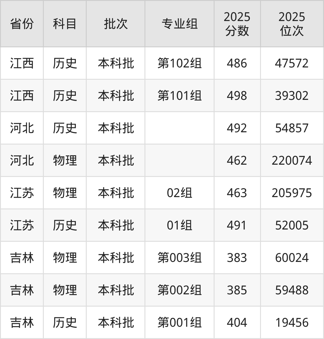 2025年张家界学院全国录取分数线是383分到503分,录取最低在吉林物理类(第003组)、录取最高在河南历史类(第101组)。各省各专业组最低分具有差异,详情如下: