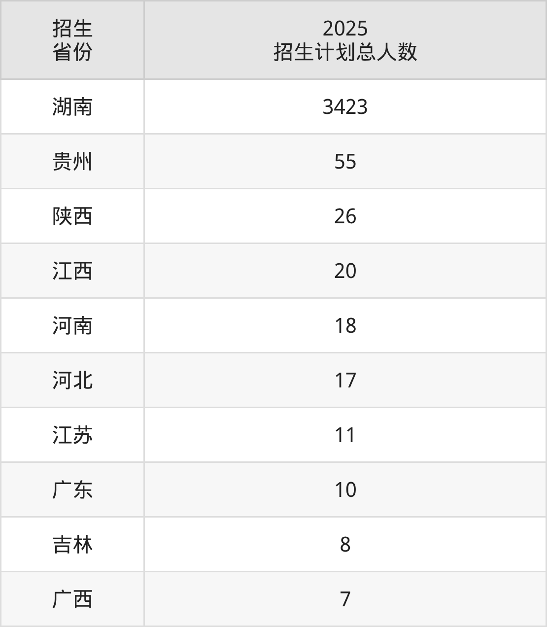2025年张家界学院面向全国10个省市开展本科招生;招生专业共27个,招生人数共3595人。2025年在湖南省招生计划总人数是3423人,其中,张家界学院在湖南省招生人数最多的是护理学。张家界学院在各省具体招生人数情况如下表。