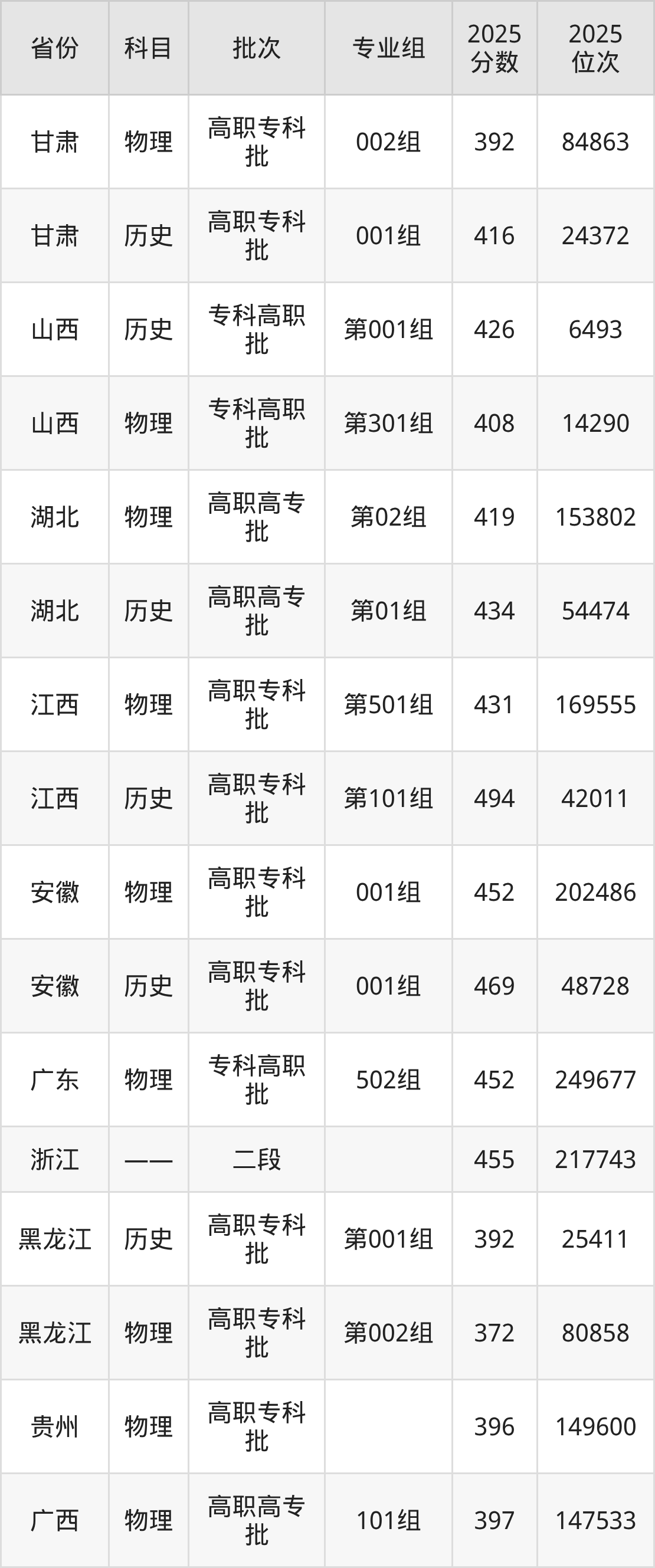 2025年浙江邮电职业技术学院全国录取分数线是372分到494分,录取最低在黑龙江物理类(第002组)、录取最高在江西历史类(第101组)。各省各专业组最低分具有差异,详情如下: